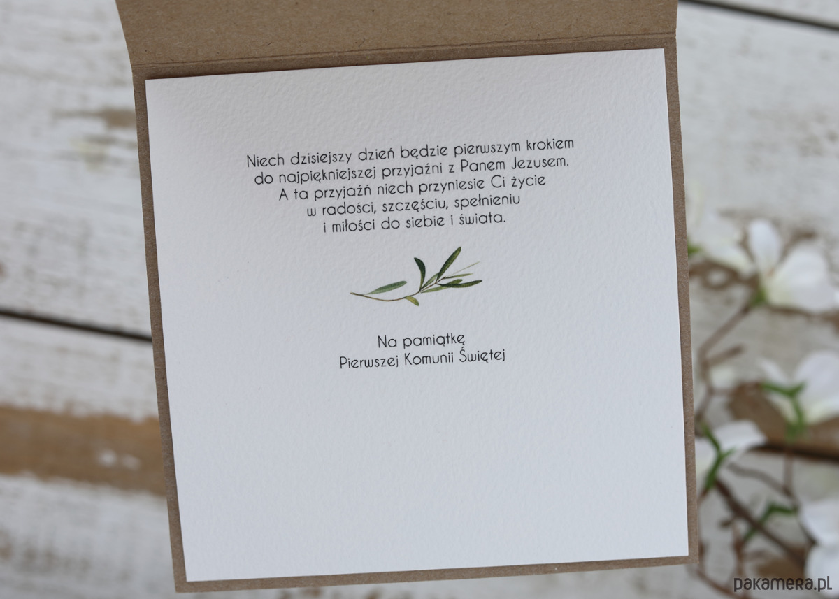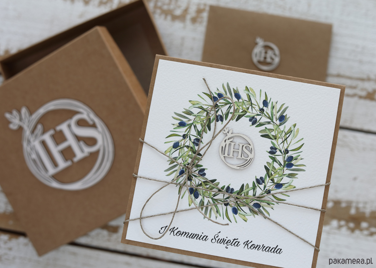 Przedmiotem oferty jest rustykalna kartka na komunię z pudełkiem i kopertą na pieniądze.