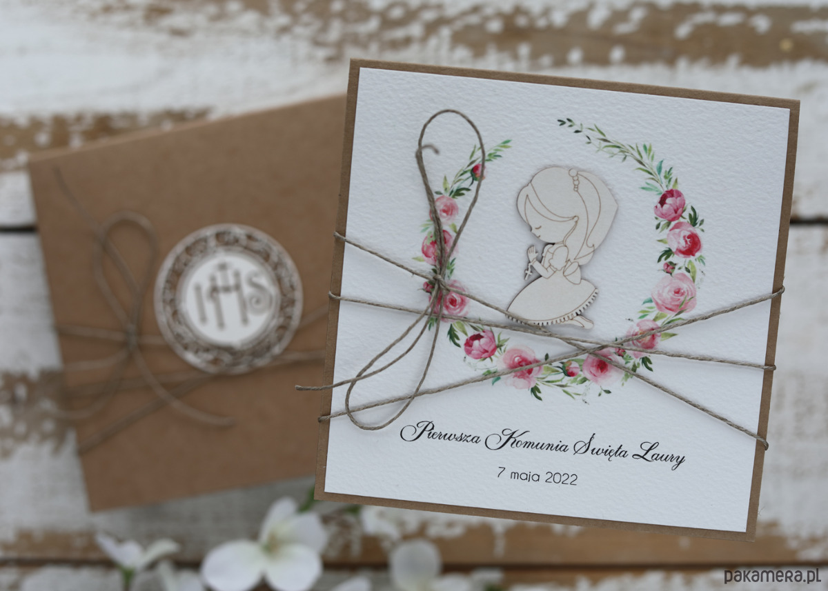 Przedmiotem oferty jest rustykalna kartka na komunię z pudełkiem.