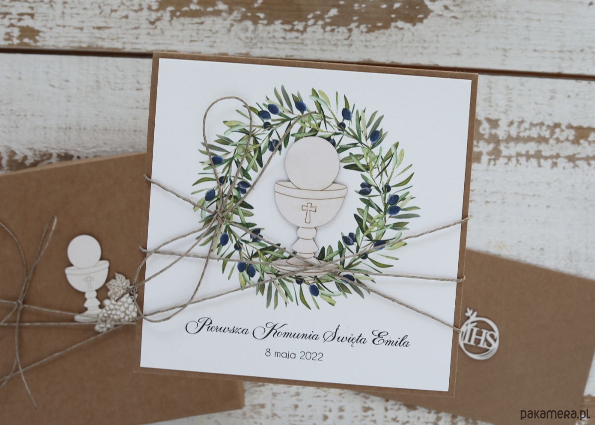 Przedmiotem oferty jest rustykalna kartka na komunię z pudełkiem i kopertą na pieniądze.