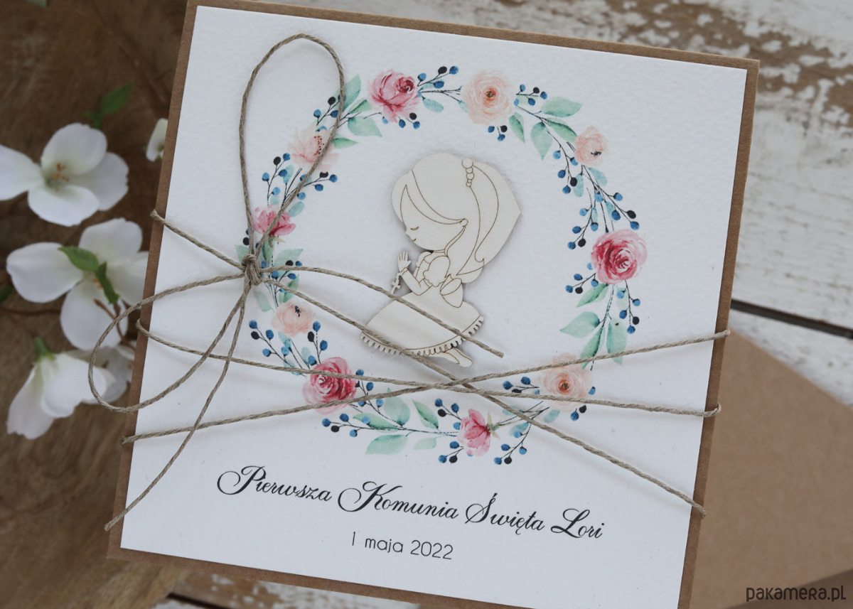 Przedmiotem oferty jest rustykalna kartka na komunię z kopertą.
