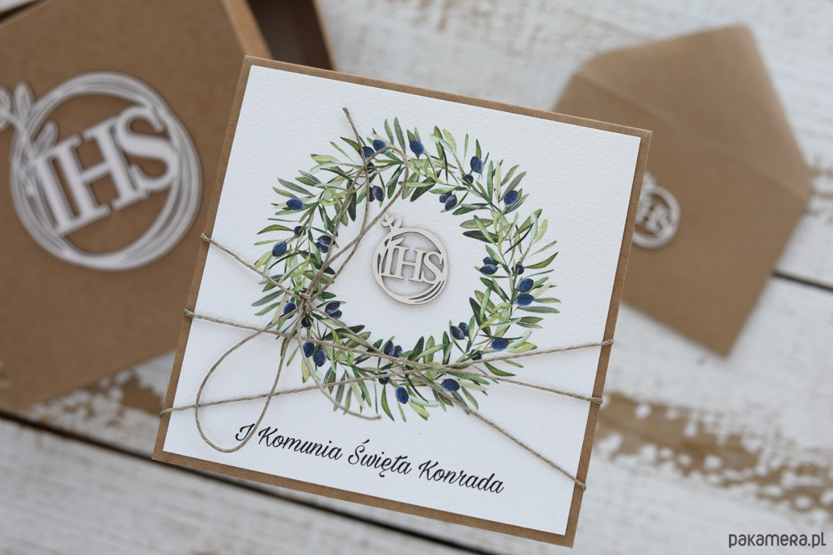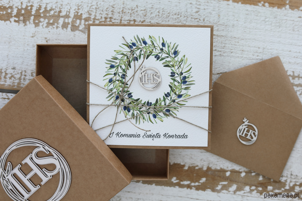 Przedmiotem oferty jest rustykalna kartka na komunię z pudełkiem i kopertą na pieniądze.