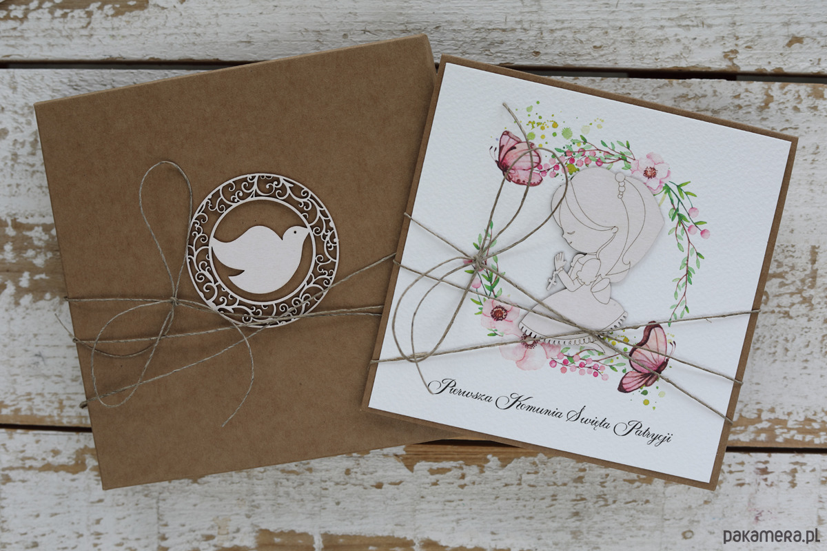 Przedmiotem oferty jest rustykalna kartka na komunię z pudełkiem.