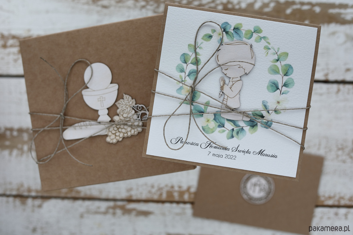 Przedmiotem oferty jest rustykalna kartka na komunię z pudełkiem i kopertą na pieniądze.