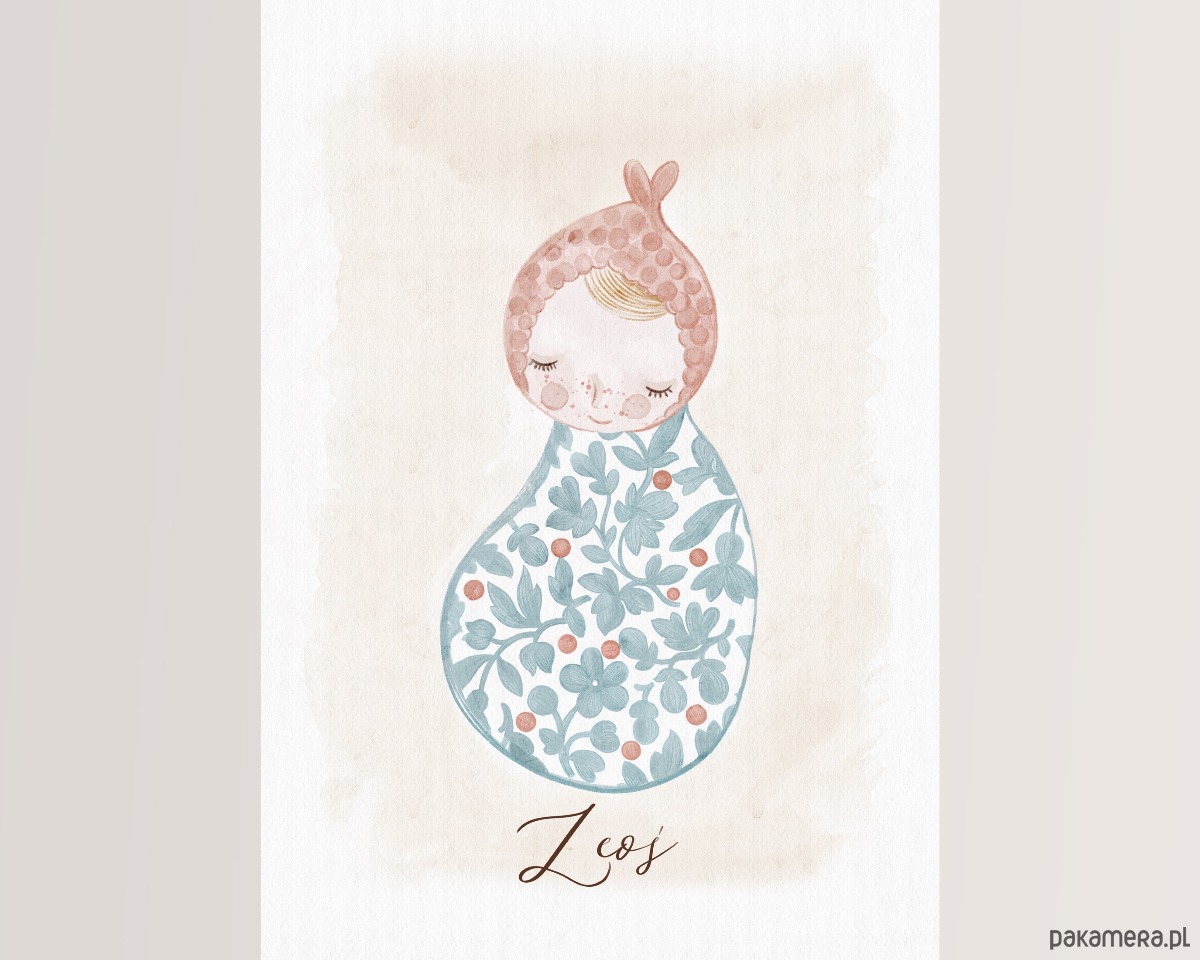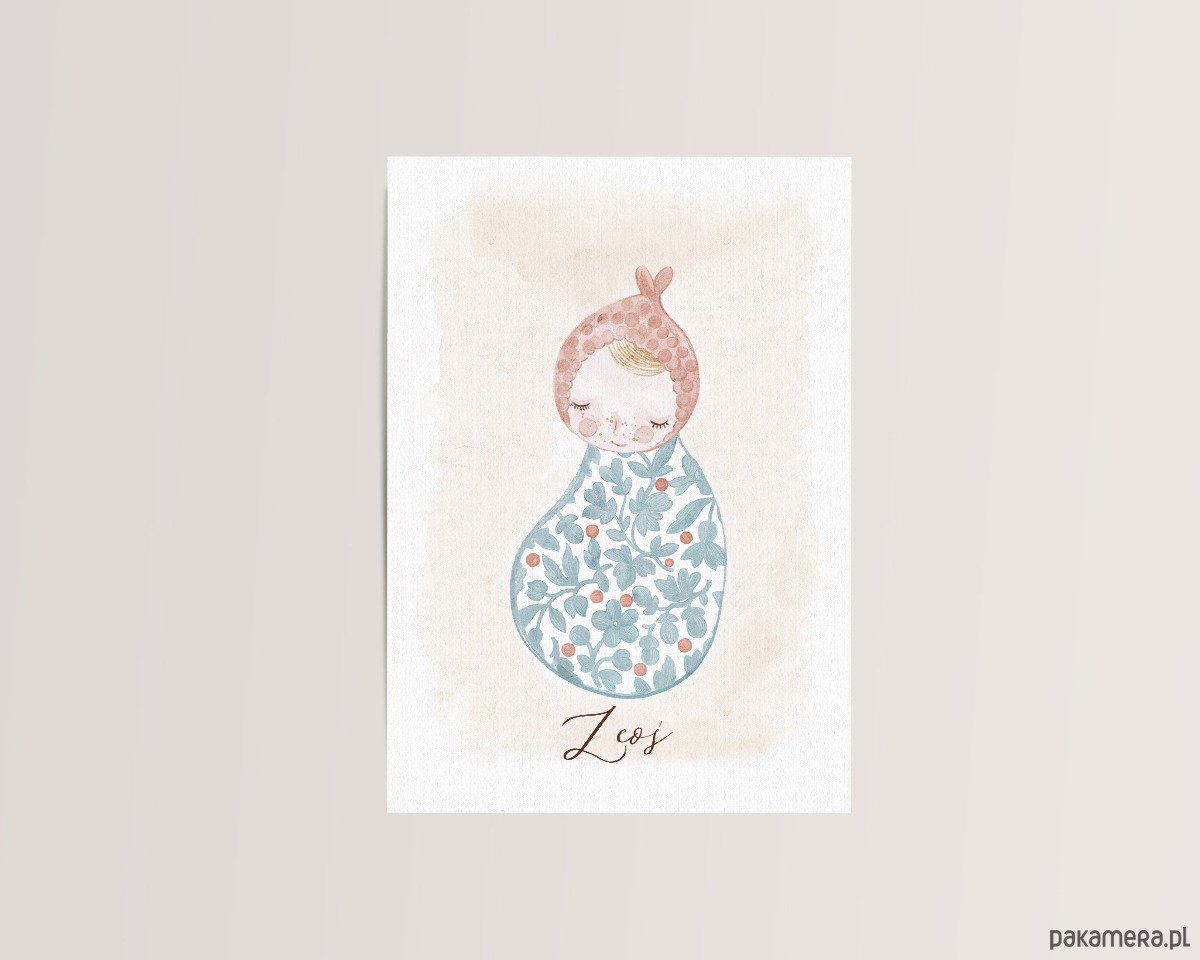 Kartka zawiera autorską ilustrację w pastelowych kolorach z imieniem dziecka.