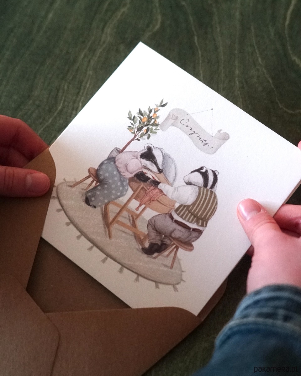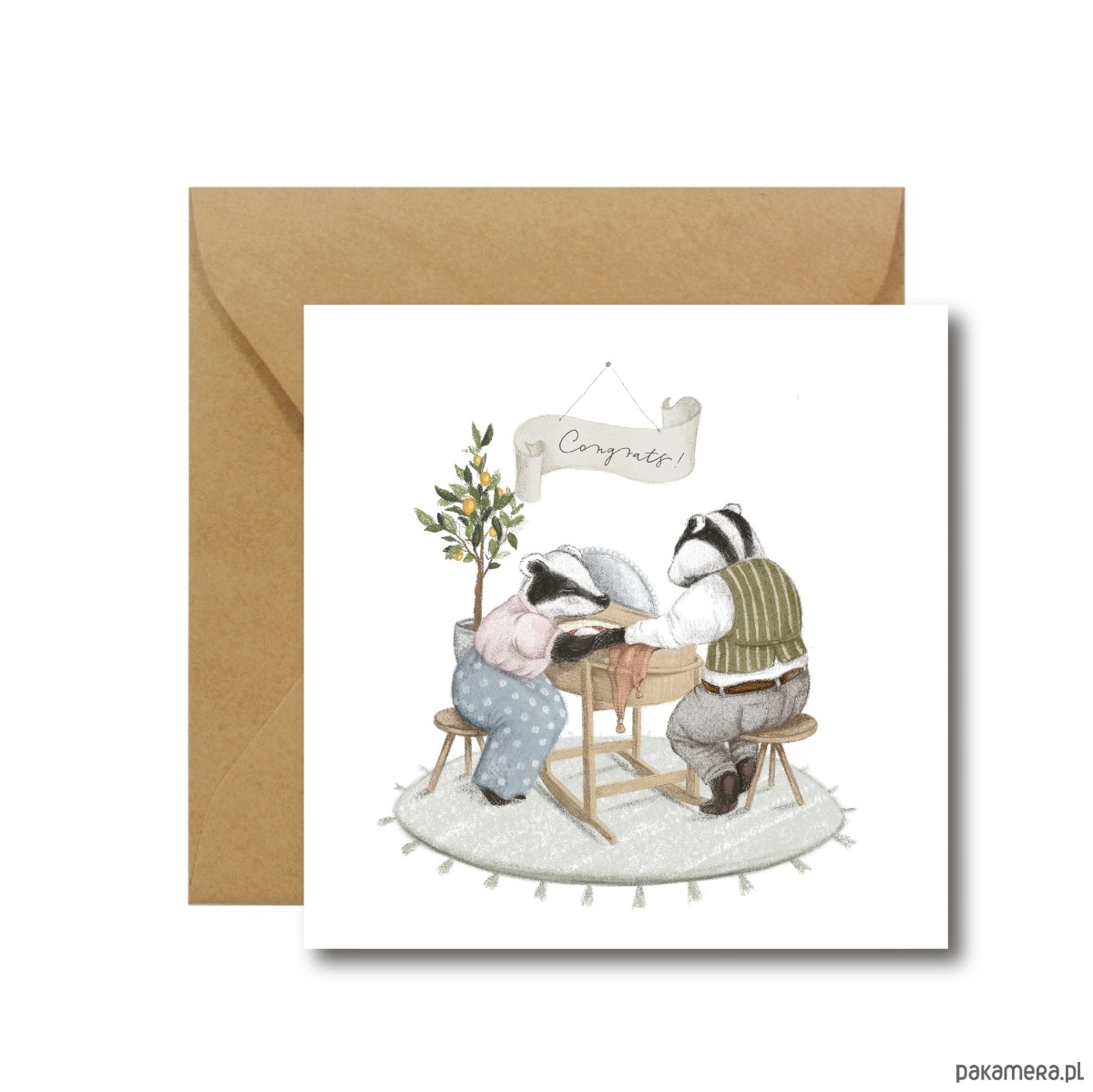Pełna czułości kartka „Congrats!” przedstawia borsuczą rodzinę pochyloną nad kołyską z noworodkiem. Nad sceną unosi się transparent z gratulacjami, a obok stoi roślinka w donicy. Delikatna, ręcznie wykonana ilustracja sprawia, że to idealny wybór na gratulacje z okazji narodzin lub adopcji dziecka.