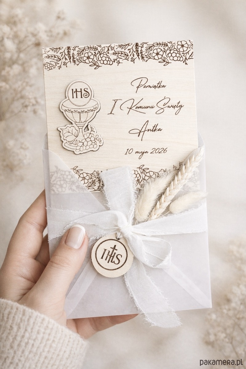Kartka na pamiątkę I Komunii Świętej DREWNIANA