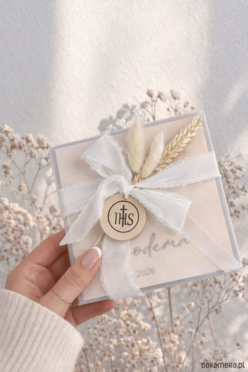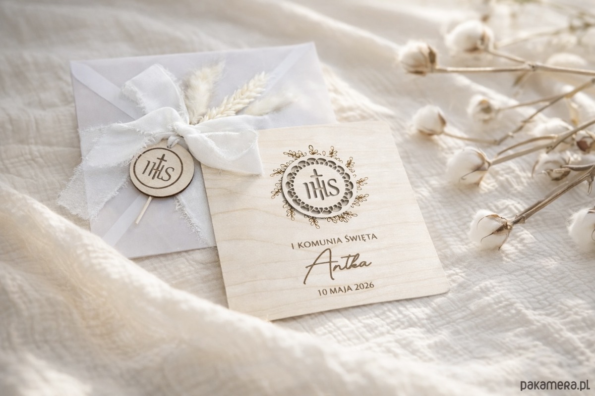 Kartka na pamiątkę I Komunii Świętej DREWNIANA