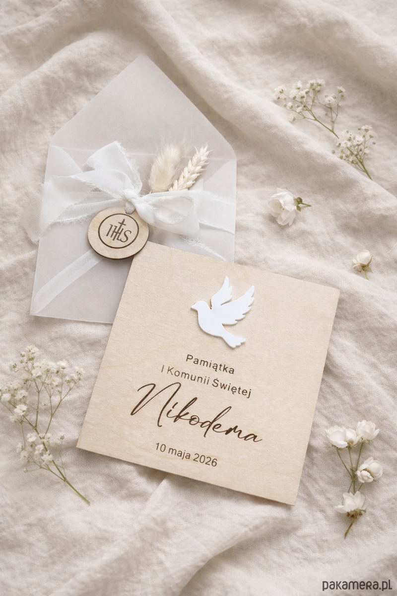 Kartka na pamiątkę I Komunii Świętej DREWNIANA