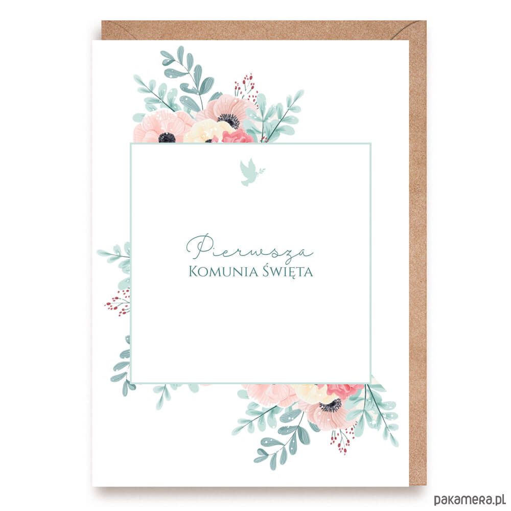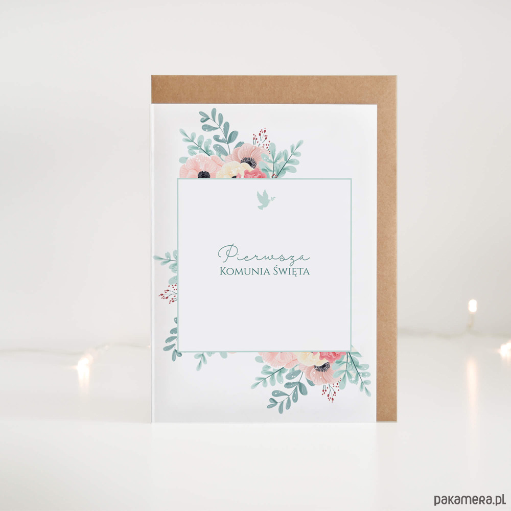 Kartka na Pierwszą Komunię Świętą kwiatowa ramka