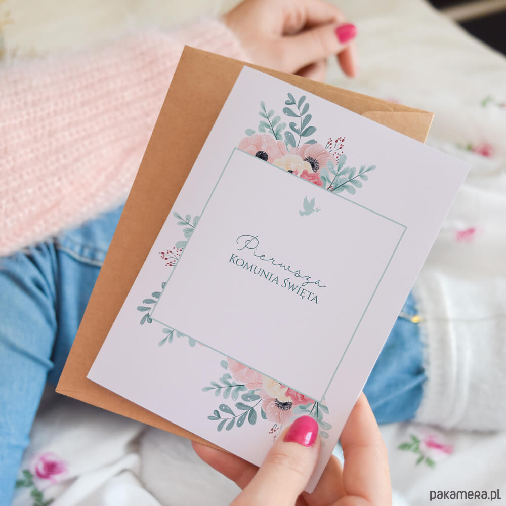 Kartka na Pierwszą Komunię Świętą kwiatowa ramka od Cardie to idealny dodatek do bukietu, prezentu albo… samodzielny gest, który mówi więcej niż tysiąc słów.
