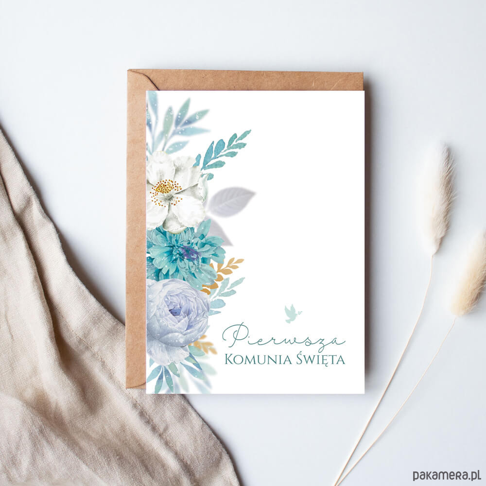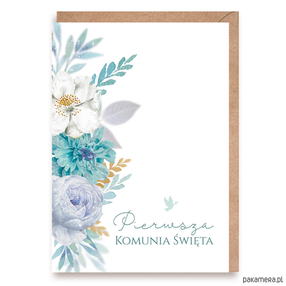 Kartka na Pierwszą Komunię Świętą niebieskie kwiaty