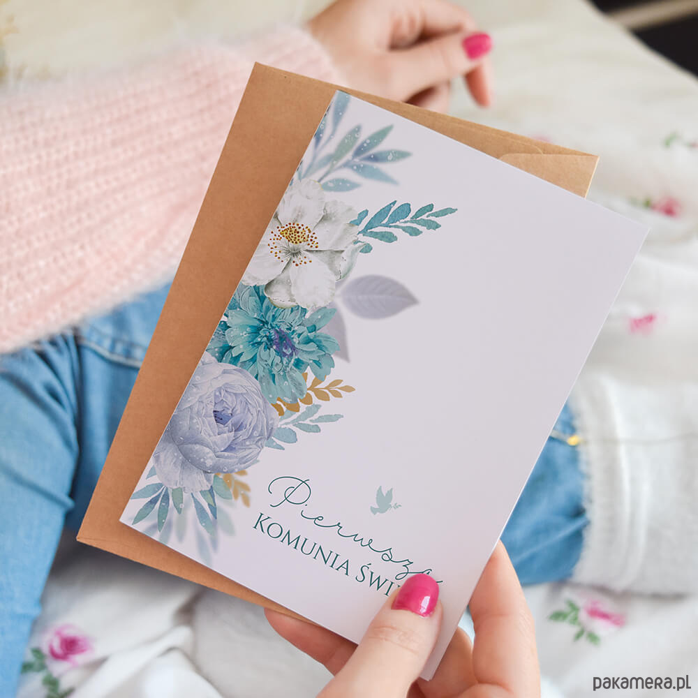 Kartka na Pierwszą Komunię Świętą niebieskie kwiaty od Cardie to idealny dodatek do bukietu, prezentu albo… samodzielny gest, który mówi więcej niż tysiąc słów.