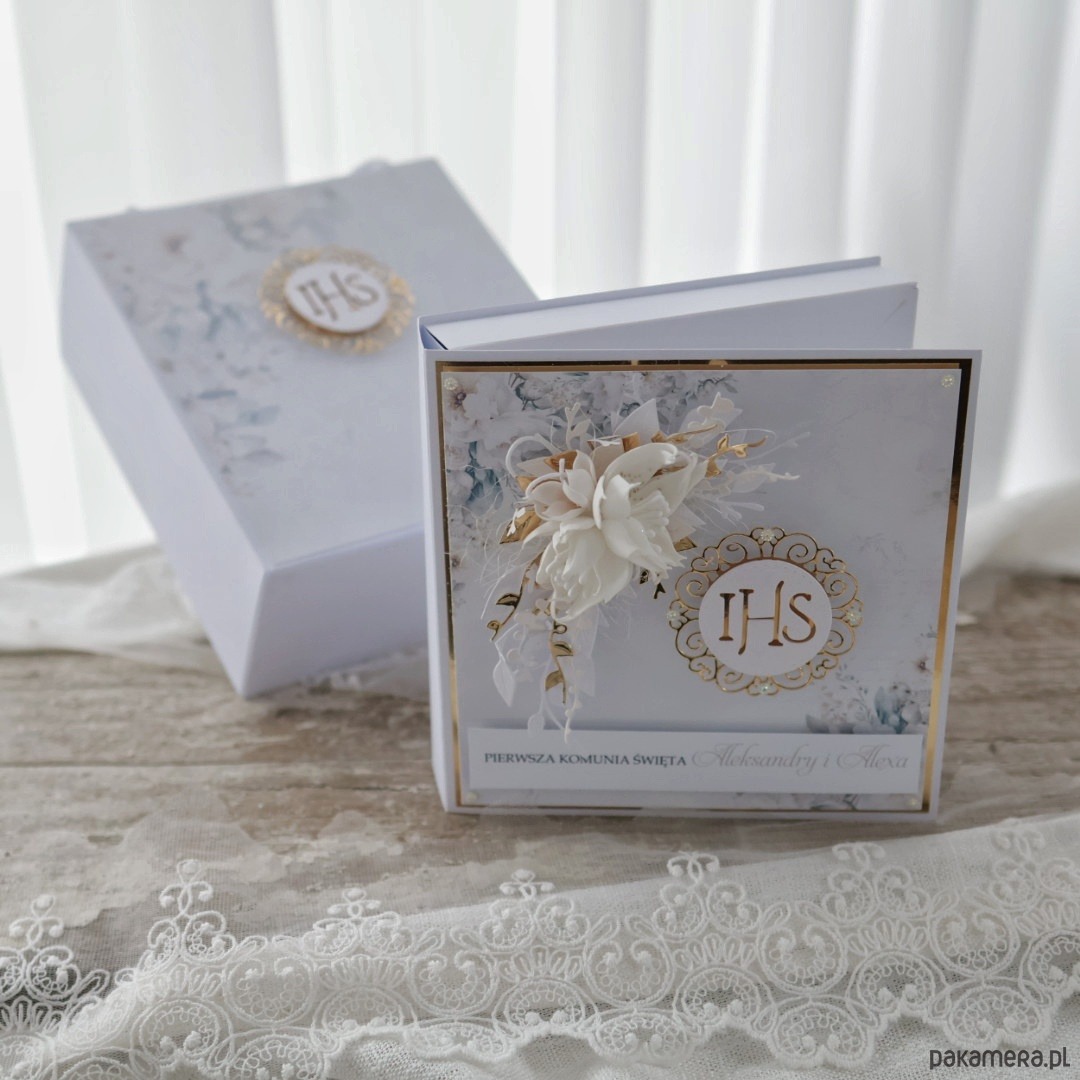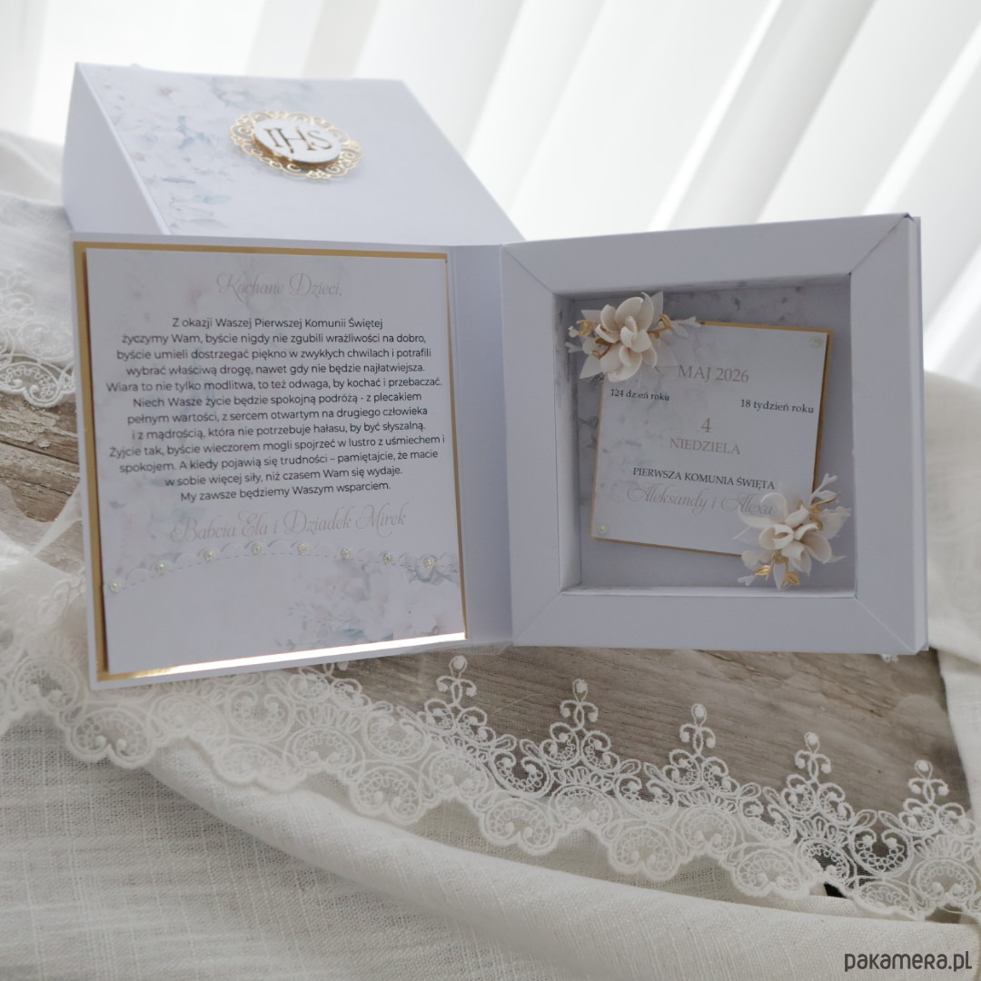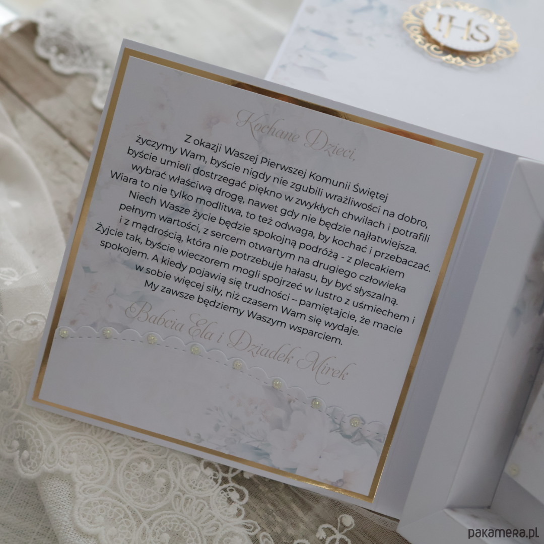 Personalizowana kartka na Pierwszą Komunię Świętą w formie księgi 3D to wyjątkowe połączenie pamiątki i eleganckiego prezentu. W środku znajdują się życzenia - możesz wybrać tekst taki jak na zdjęciu lub dodać własny. Istnieje możliwość dodania kieszonki na pieniądze.