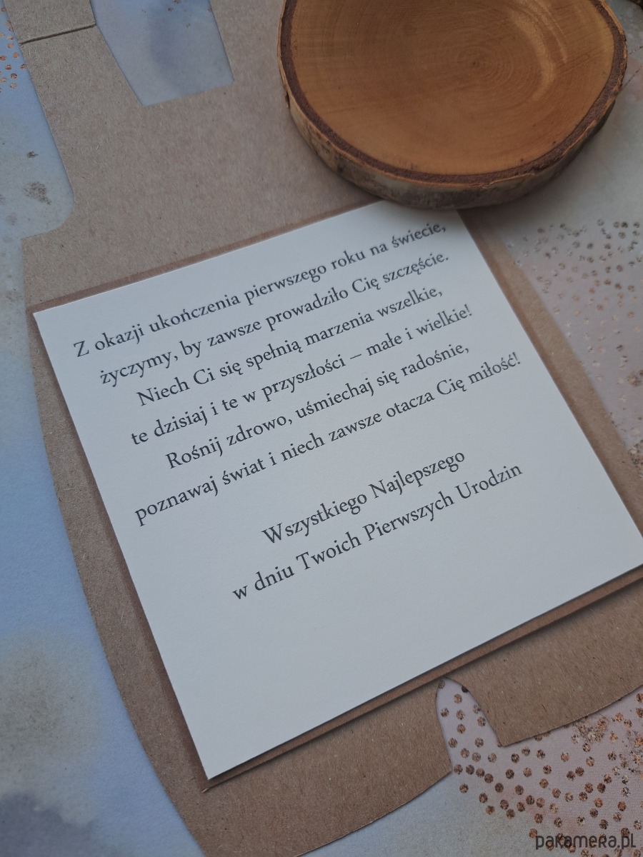 Ręcznie robiona kartka na roczek dla chłopca. Kartka w kształcie ogrodniczek.