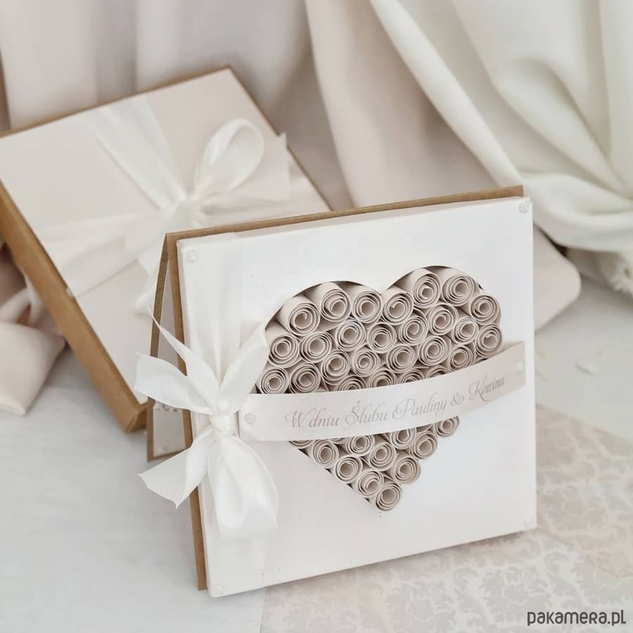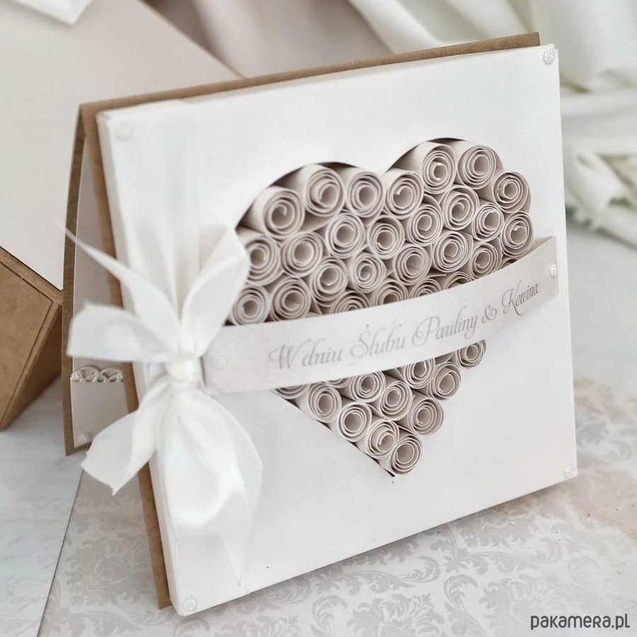 Na froncie – misternie ułożone serce z papierowych ruloników oraz personalizowana dedykacja z imionami Pary Młodej.