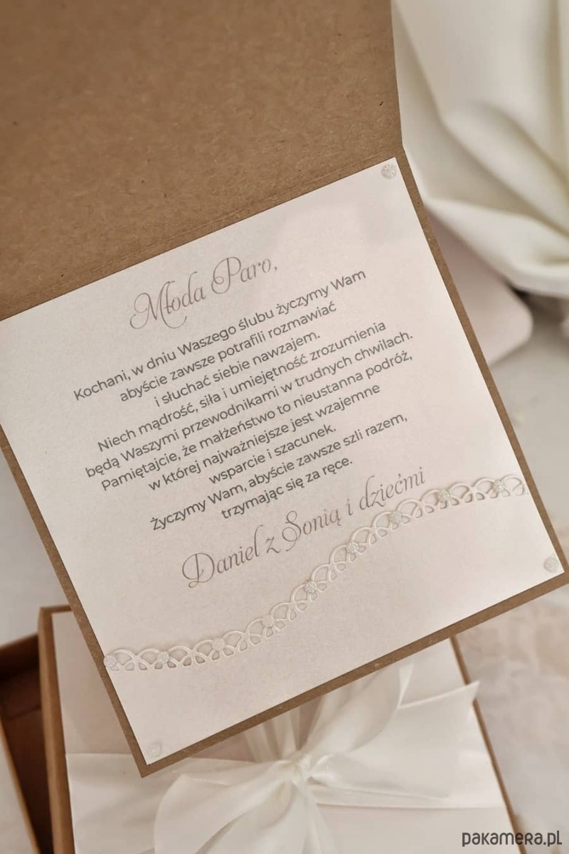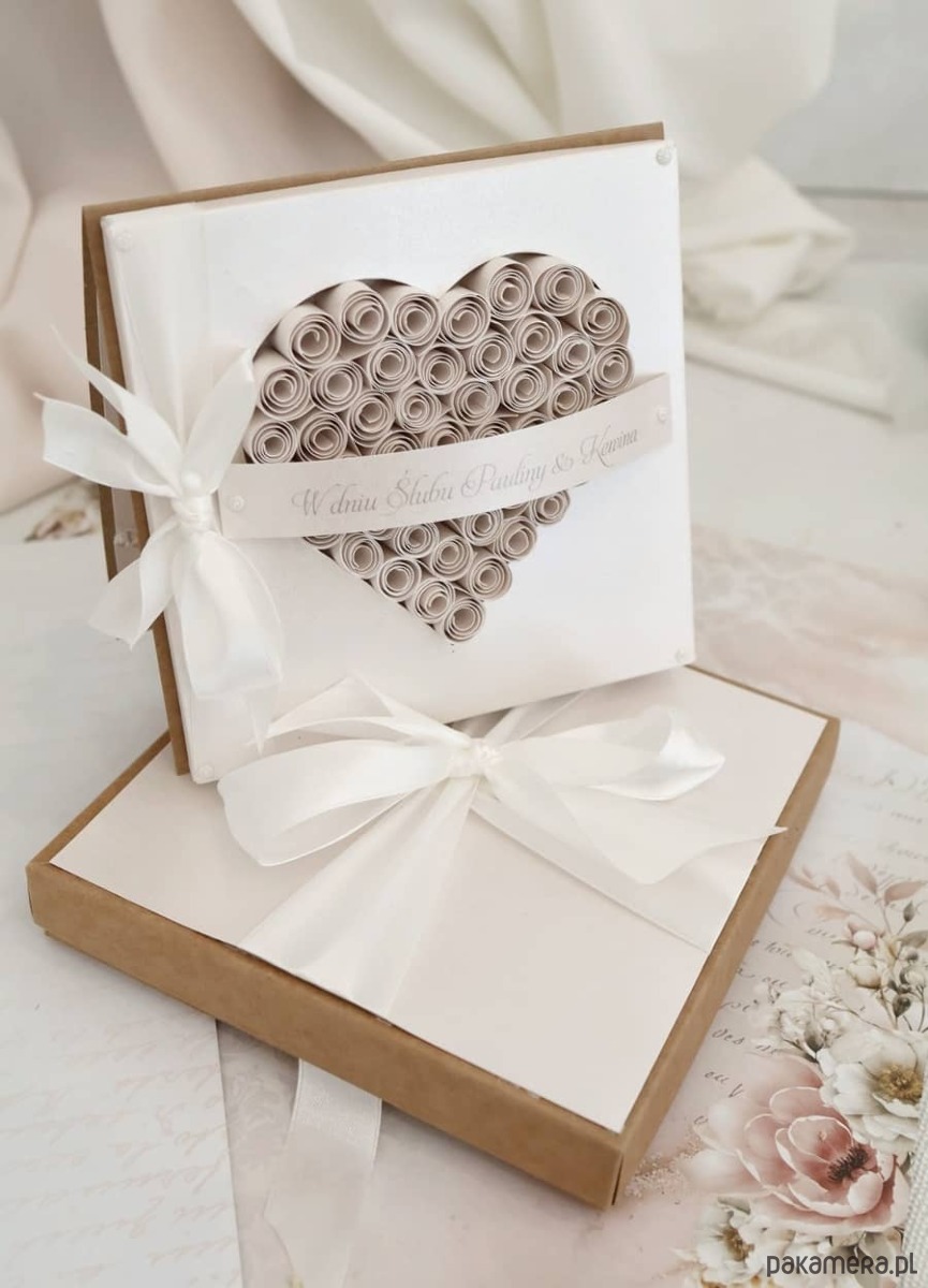 Ta ręcznie wykonana kartka ślubna z pudełkiem to połączenie subtelnej elegancji i naturalnej estetyki.