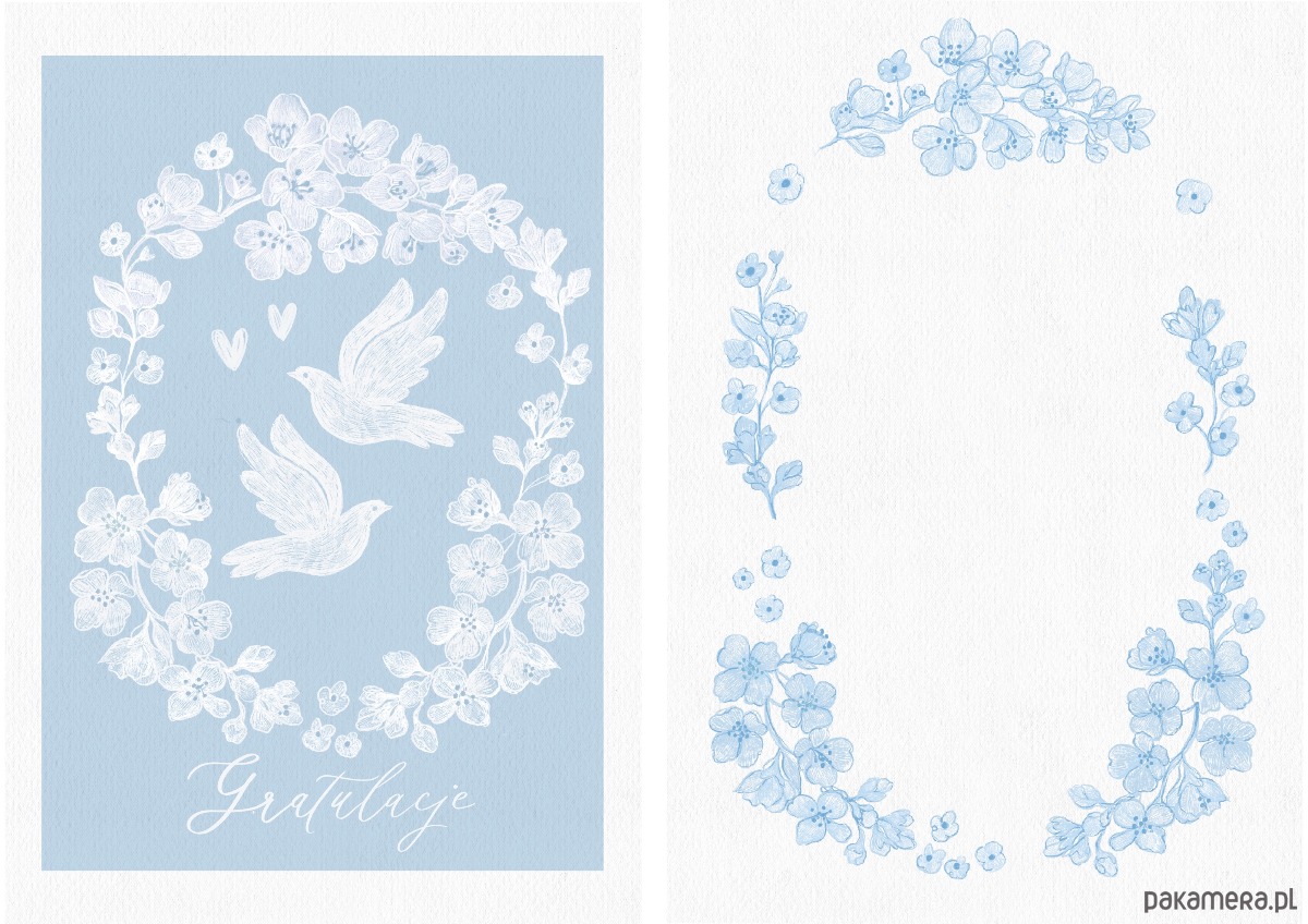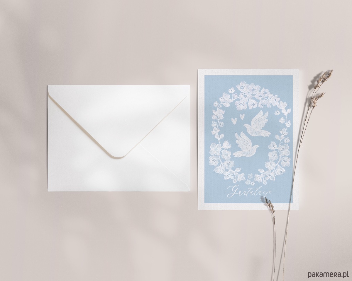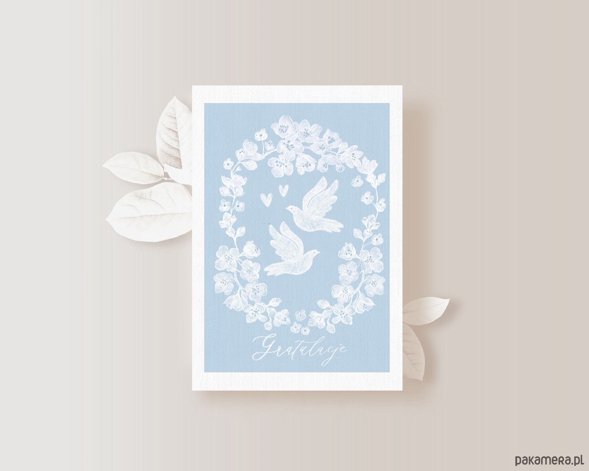 Kartka zawiera autorską ilustrację z gołąbkami w ukwieconych gałązkach.