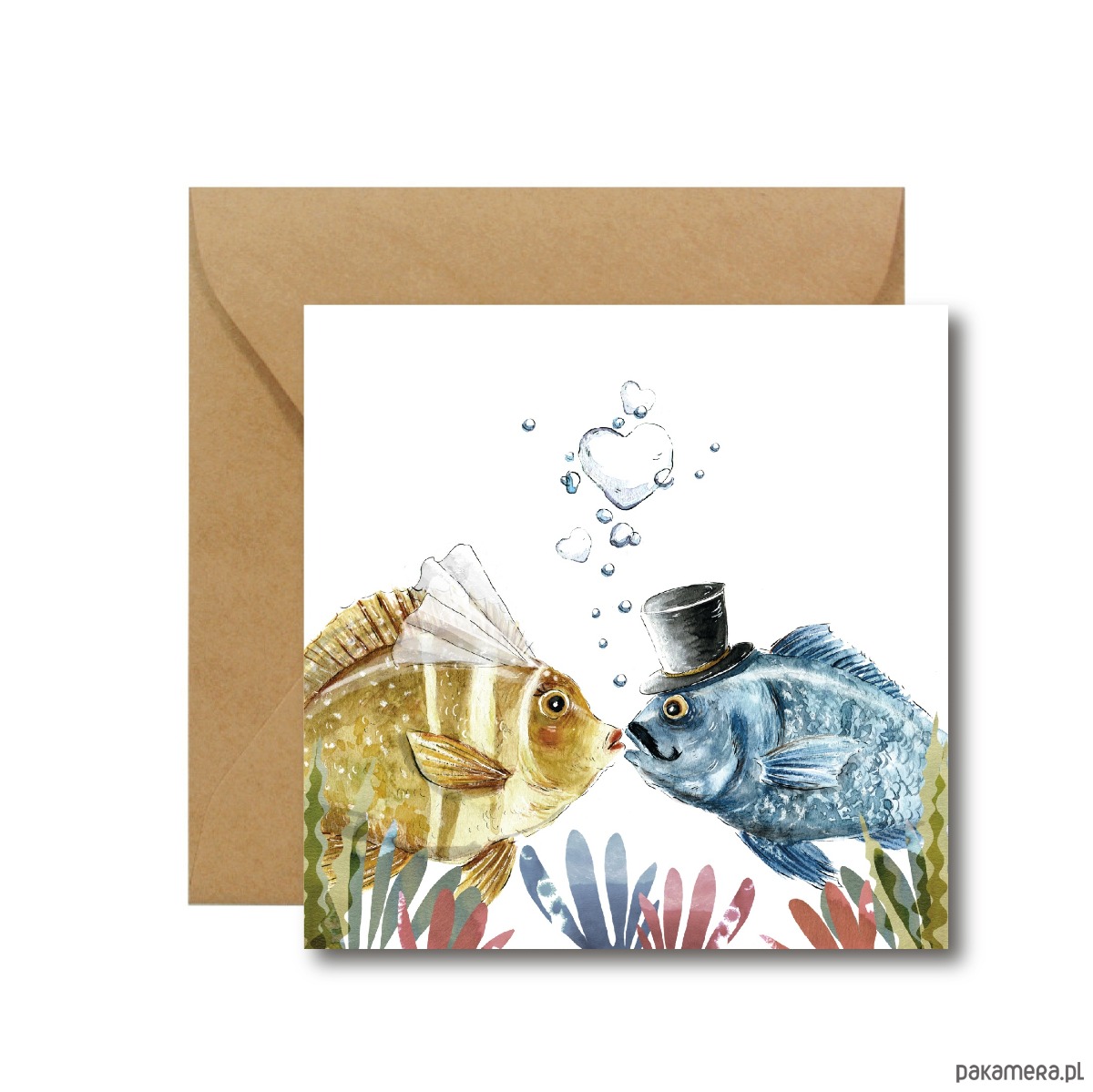 Kartka z okazji ślubu z motywem zakochanych rybek.