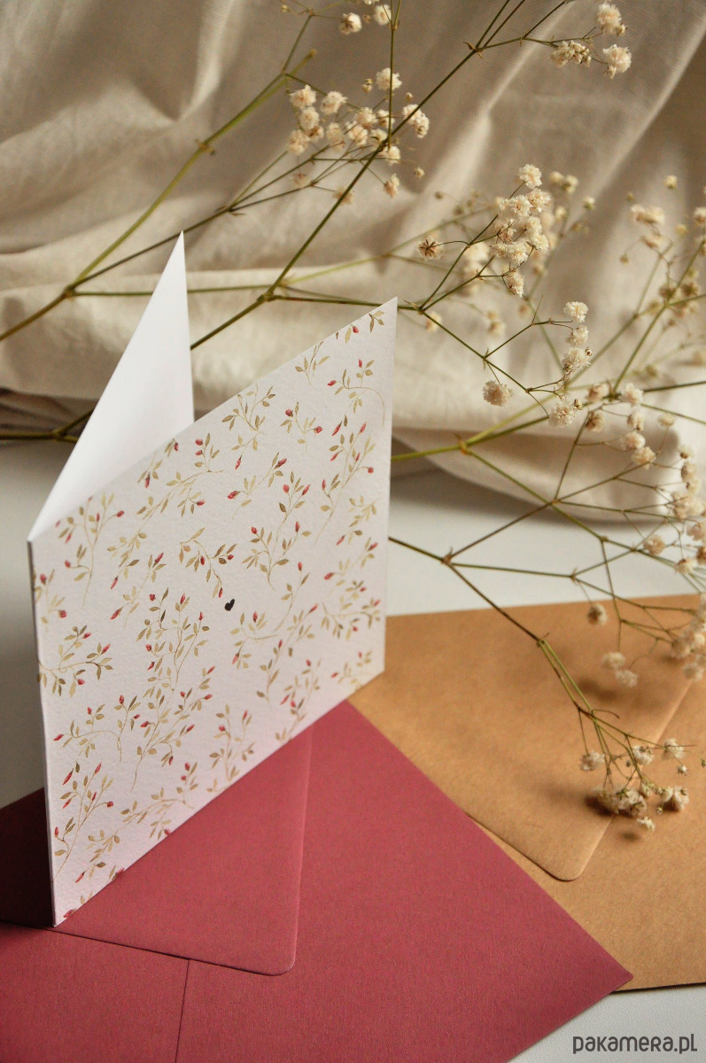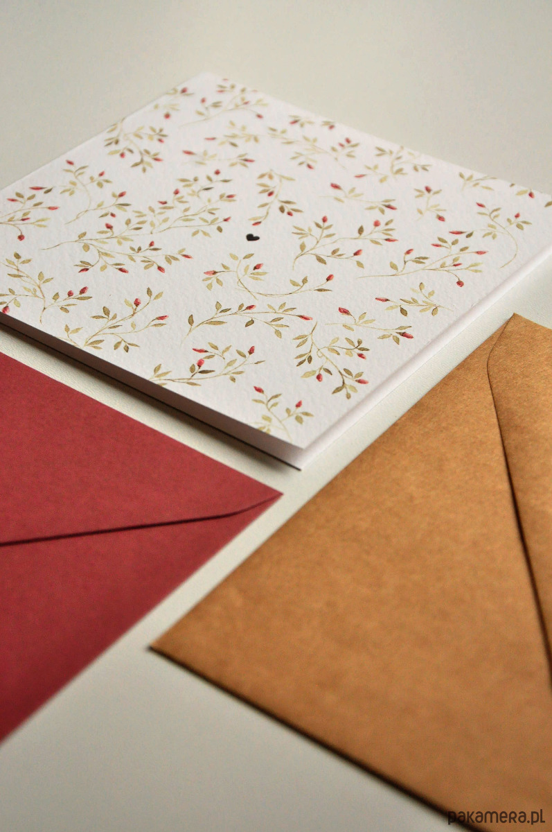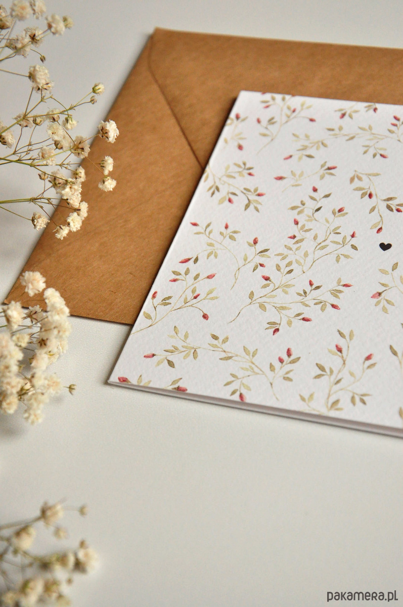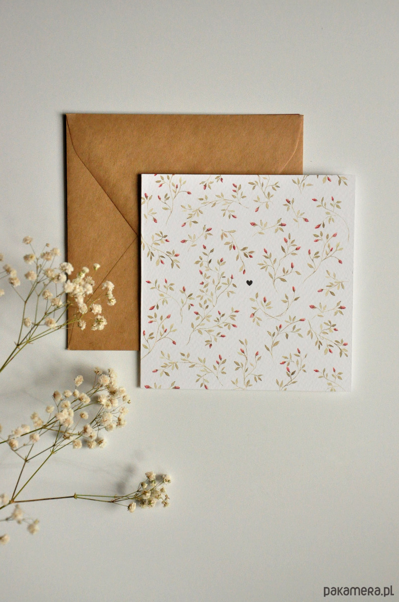 Kartka z autorską ilustracją paczków róży oraz małym serduszkiem