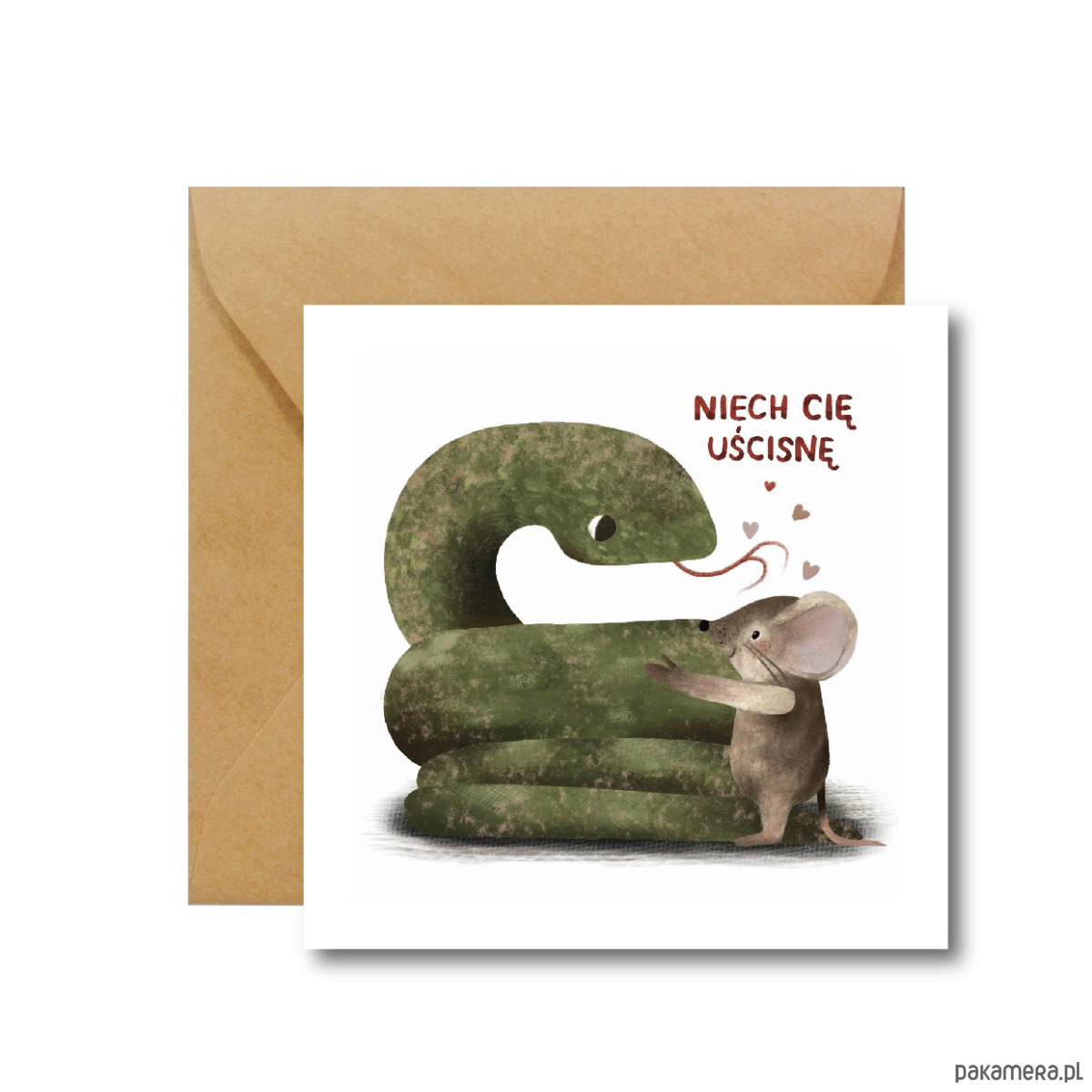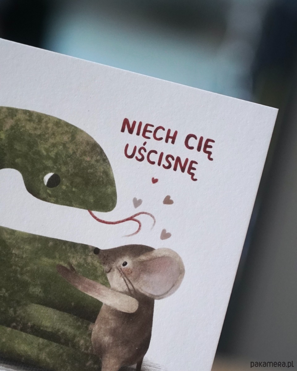 Kartka „Niech Cię uścisnę” to mała ilustracyjna opowieść o bliskości, która nie musi być dosłowna. Wąż i myszka spotykają się tu w zaskakująco czułym geście – pełnym humoru, lekkości i przewrotnego uroku.