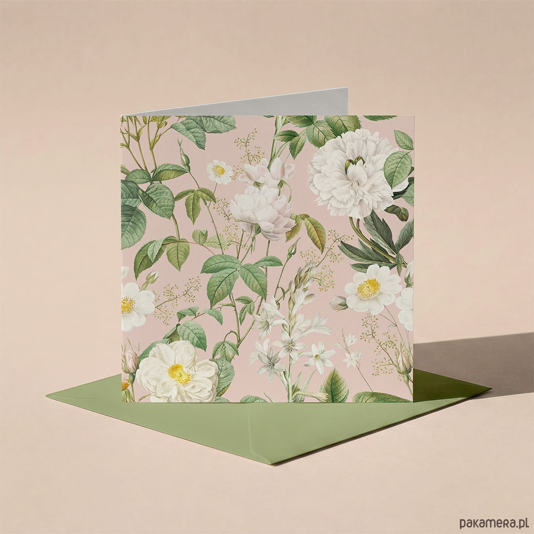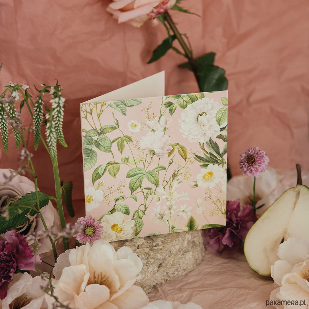 Kartka okolicznościowa z delikatnym, botanicznym motywem, która podkreśli wyjątkowość każdej okazji. Kwadratowy, składany format 15 × 15 cm prezentuje się elegancko i świetnie dopełnia prezent. Wnętrze kartki czyste - gotowe na Twoje osobiste życzenia, ciepłe słowa i emocje, które chcesz przekazać.
