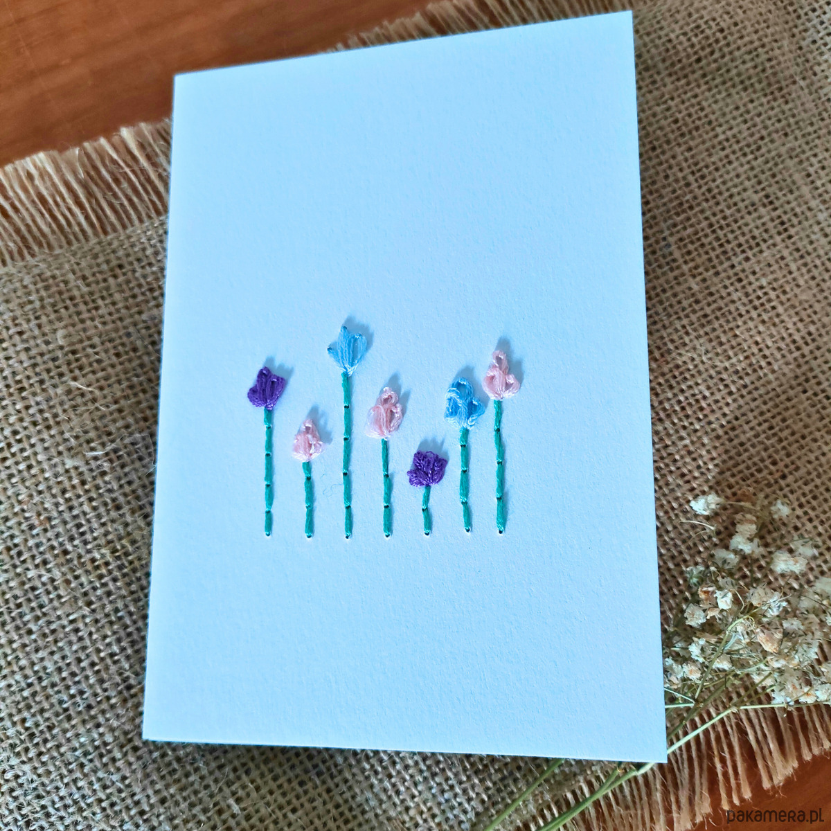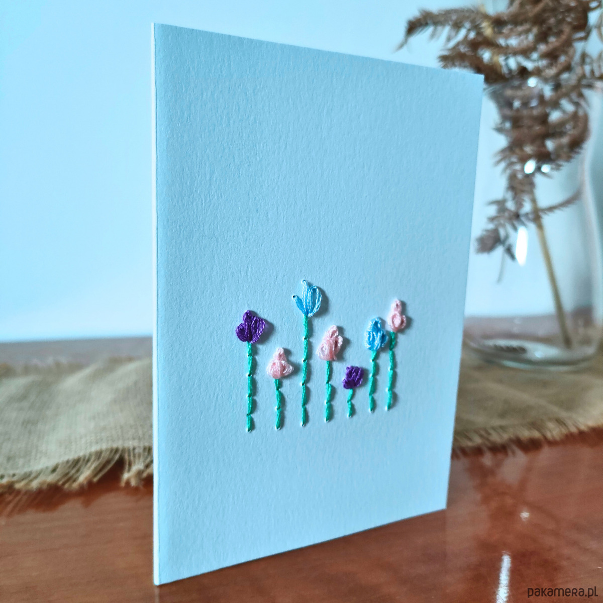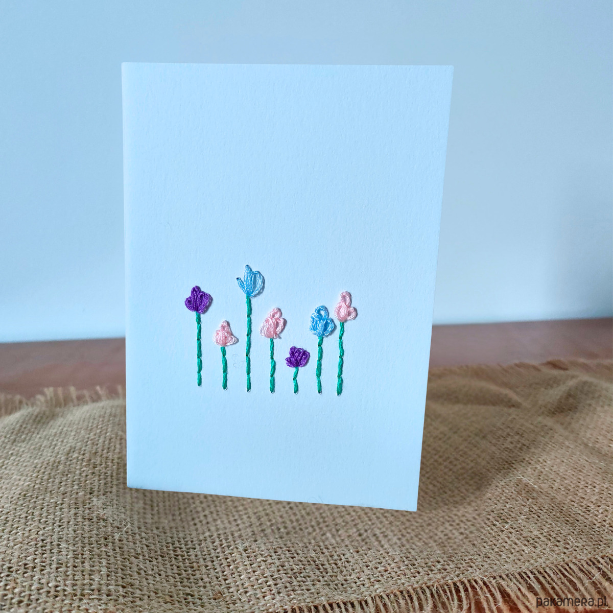 Siedem minimalistycznych kolorowych kwiatów, delikatnie haftowanych niczym wspomnienie letniej łąki, tworzy kompozycję pełną spokoju i harmonii. To nie jest zwykła kartka – to mały kawałek czułości, który możesz podarować komuś ważnemu.
