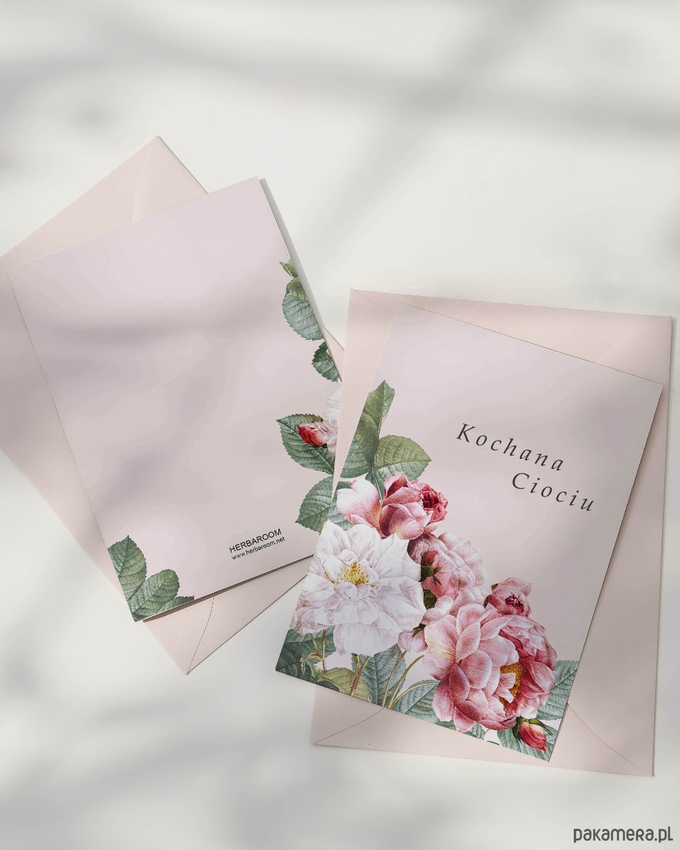 Składana kartka z motywem róż w rozmiarze 12x17cm bez tekstu w środku.
