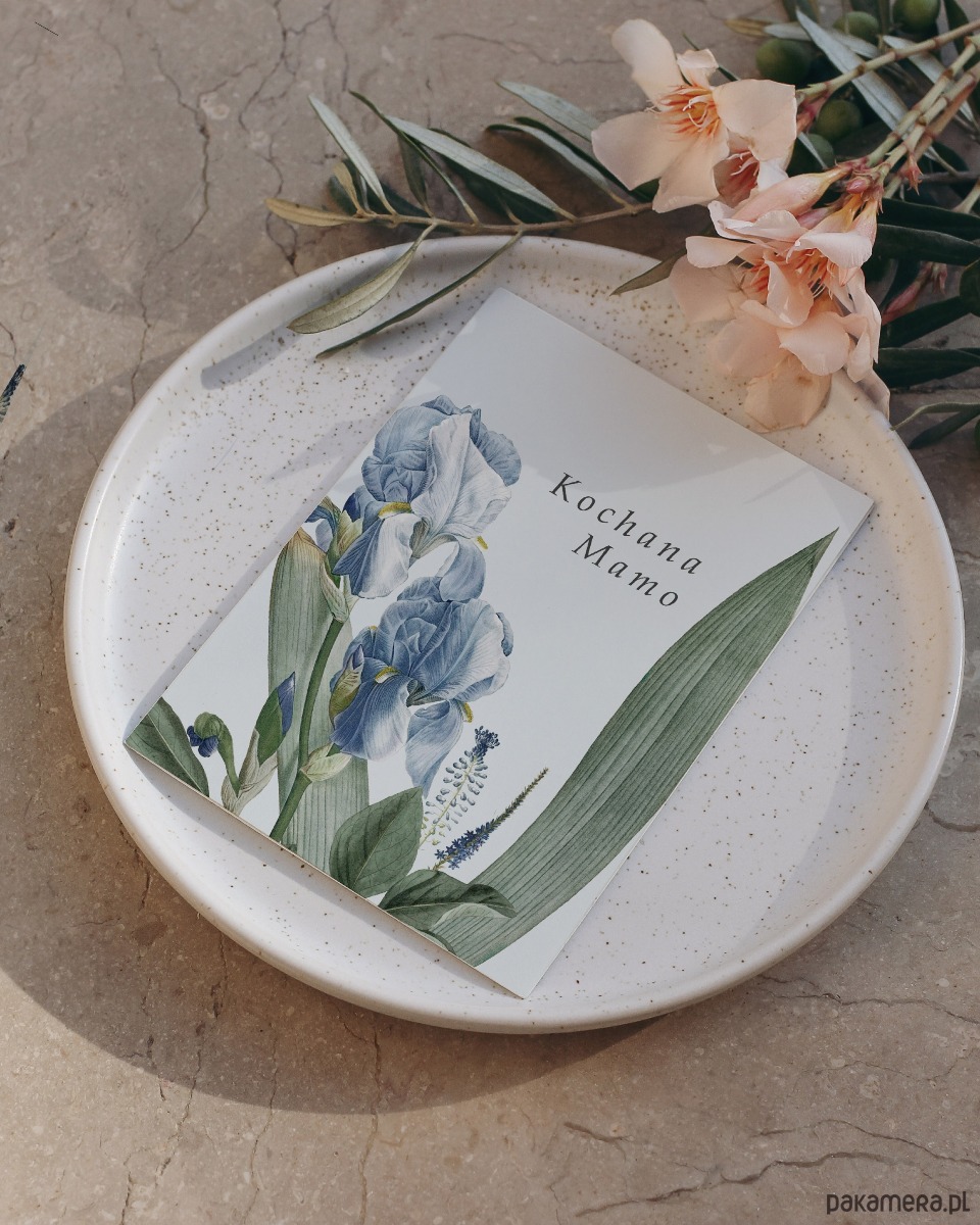 Składana kartka z motywem irysów w rozmiarze 12x17cm bez tekstu w środku.