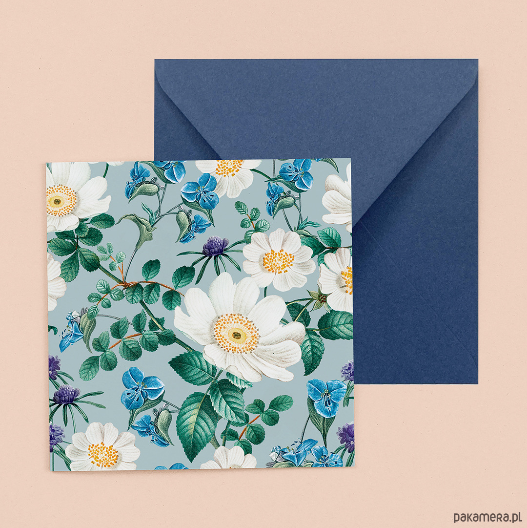 Kartka okolicznościowa z kwiatowym motywem. Kwadratowa, składana, o wymiarach 15x15 cm. W środku czysta, aby pomieścić wszystkie Twoje życzenia i miłe słowa.