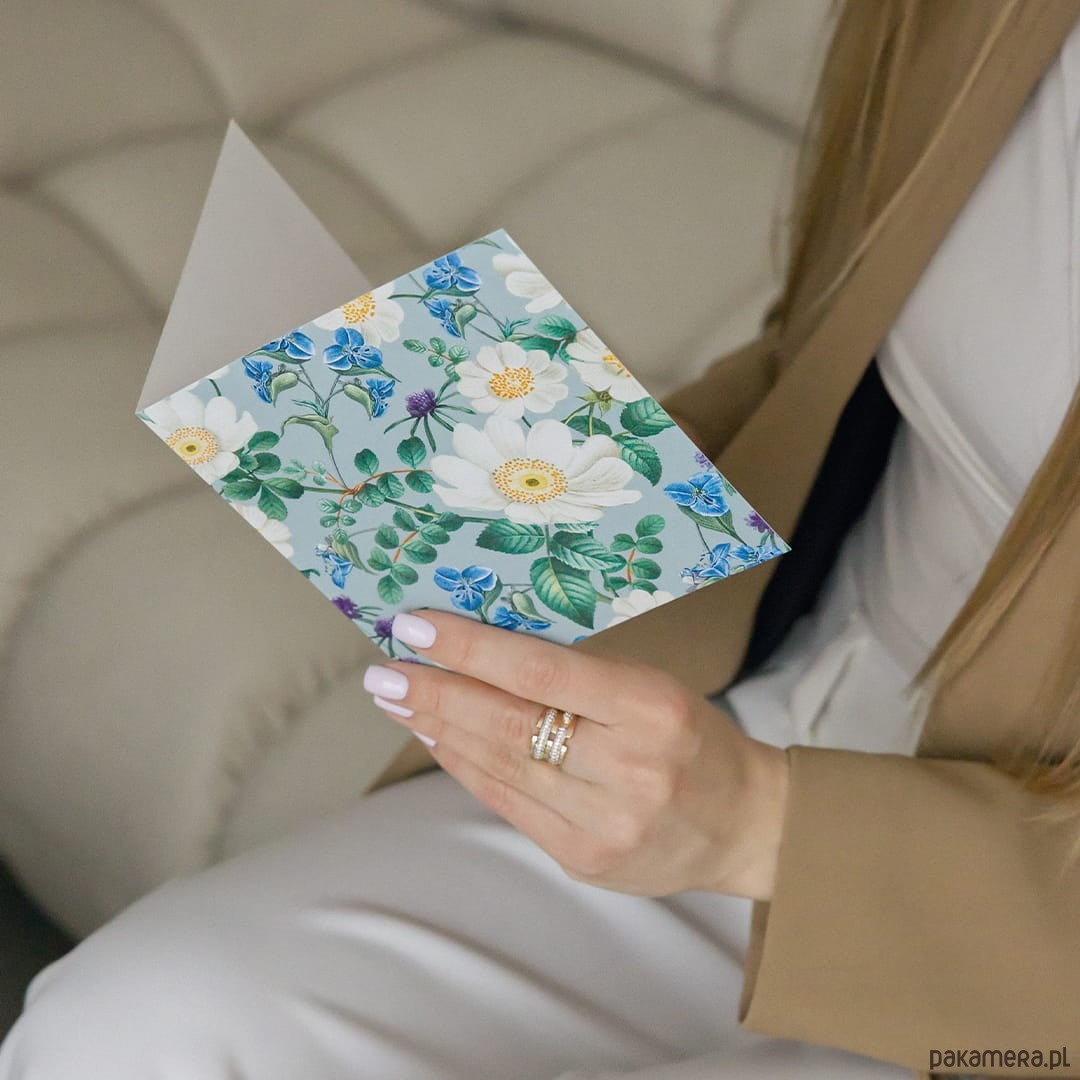 Kartka okolicznościowa z delikatnym, botanicznym motywem, która podkreśli wyjątkowość każdej okazji. Kwadratowy, składany format 15 × 15 cm prezentuje się elegancko i świetnie dopełnia prezent. Wnętrze kartki czyste - gotowe na Twoje osobiste życzenia, ciepłe słowa i emocje, które chcesz przekazać.