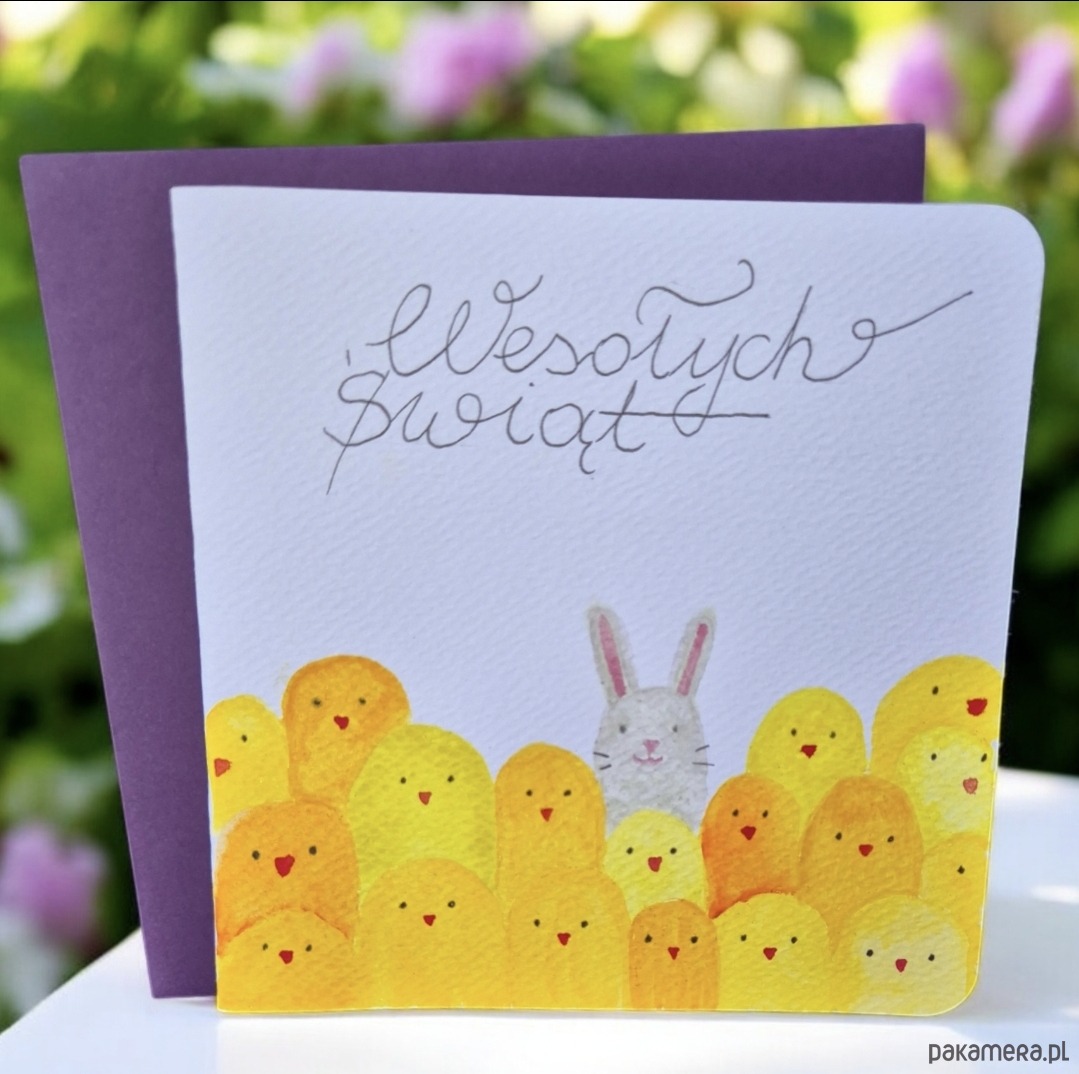 Wesoła kartka okolicznościowa ręcznie malowana akwarelami na Wielkanoc.