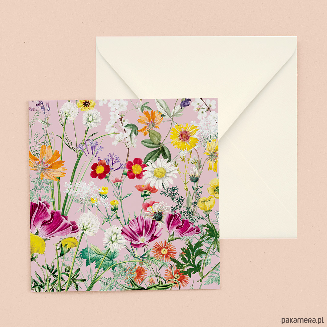 Kartka okolicznościowa z kwiatowym motywem. Kwadratowa, składana, o wymiarach 15x15 cm. W środku czysta, aby pomieścić wszystkie Twoje życzenia i miłe słowa.