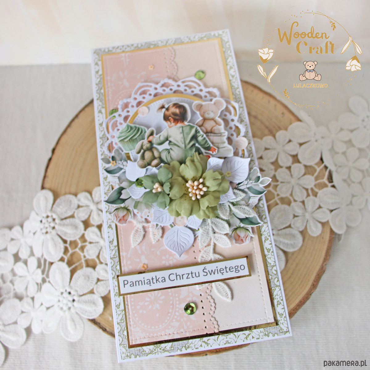 Przepiękna pamiątka chrztu świętego, roczku bądź narodzin w pięknych odcieniach brzoskwini, zgaszonej zieleni i bieli z dodatkiem złotych, błyszczących akcentów. Kartka wykonana z mixu dziecięcych kolekcji papierów.