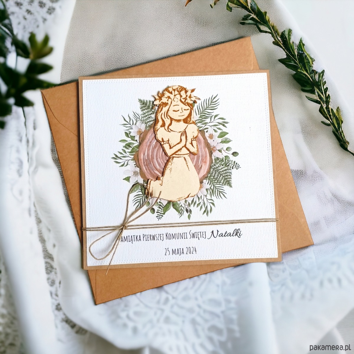 Kartka, PERSONALIZACJA : I Komunia : drewno: dziewczynka..