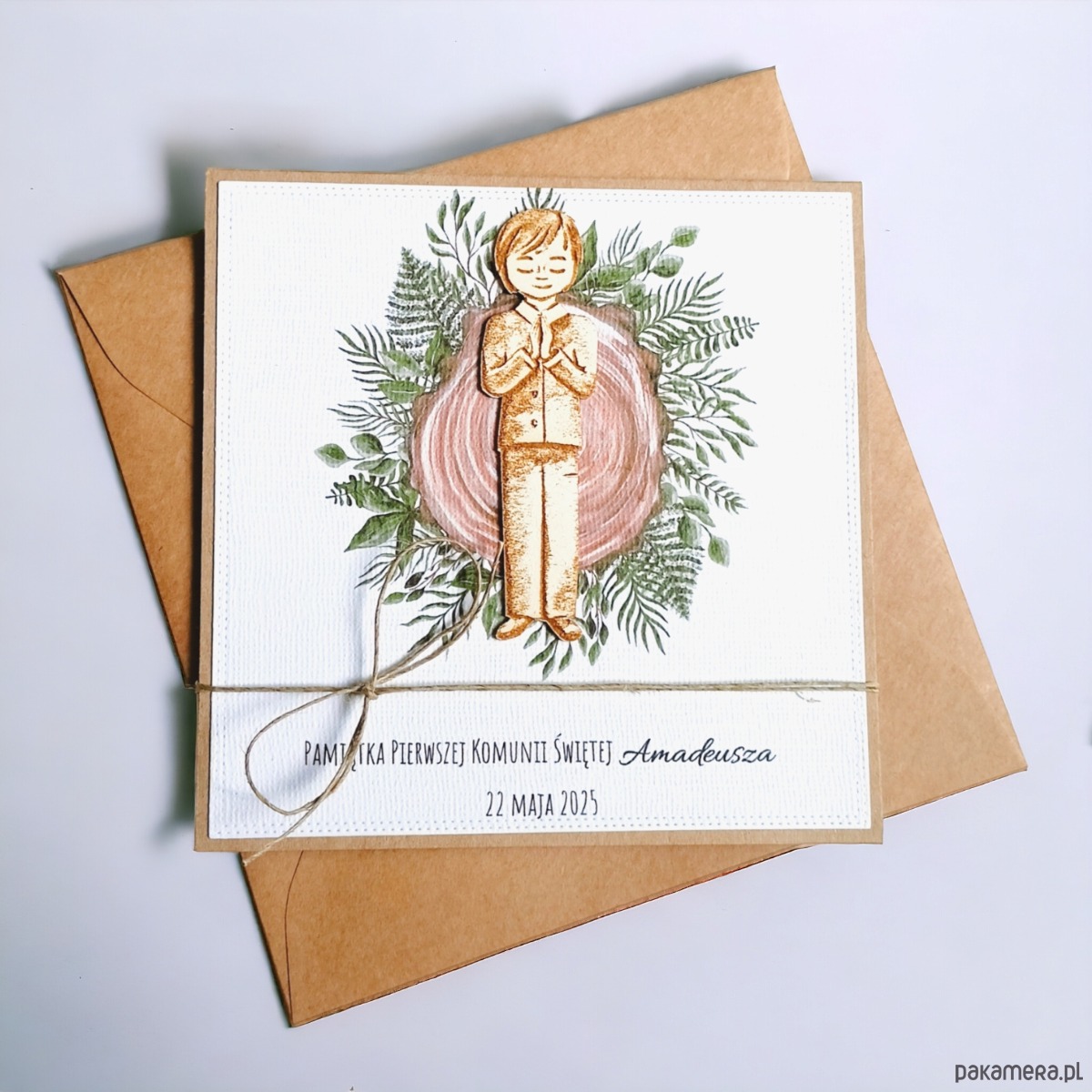 Kartka, PERSONALIZACJA : I Komunia Święta : drewno: chłopiec
