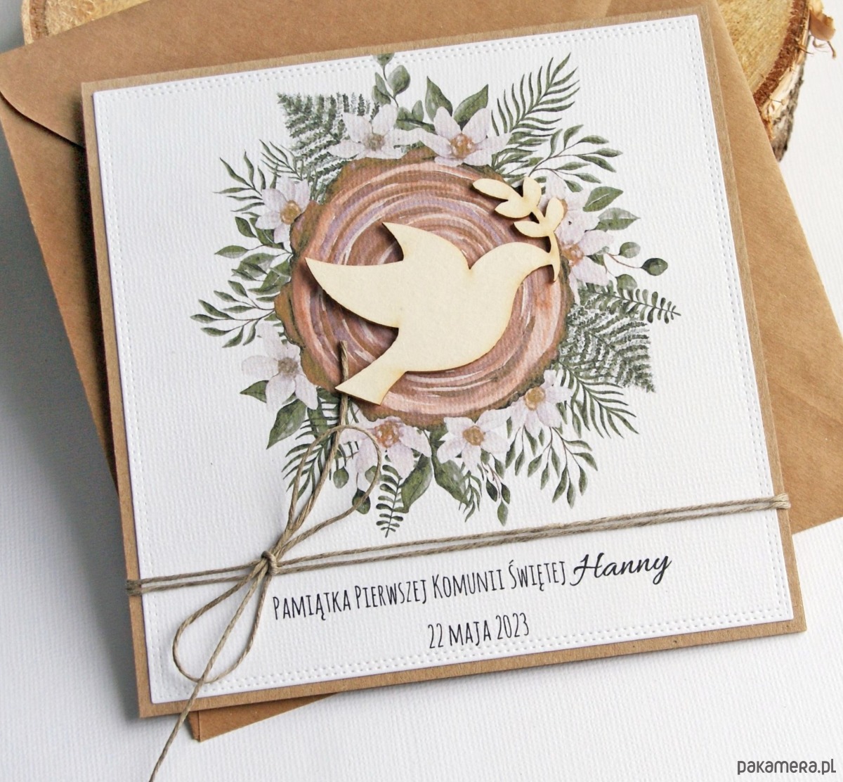 Kartka, PERSONALIZACJA : I Komunia Święta : drewno: gołąb