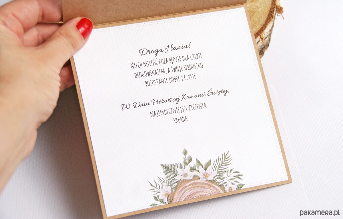 Życzenia w ozdobnej formie wydrukowane na tym samym papierze ozdobnym co front kartki.