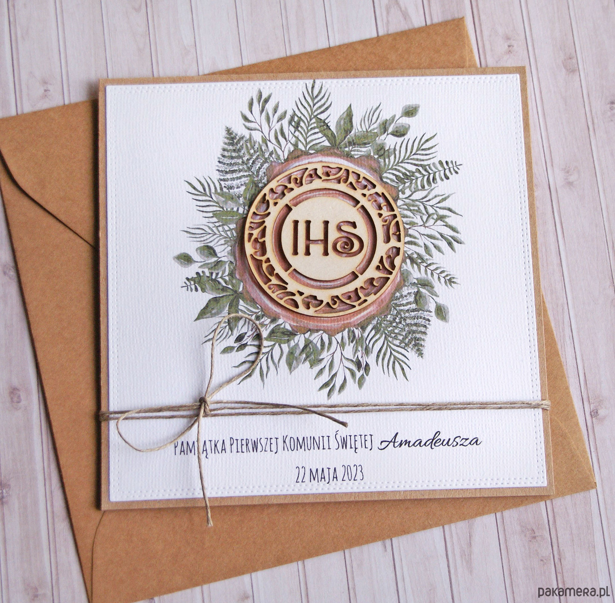 Kartka, PERSONALIZACJA : I Komunia Święta : drewno IHS