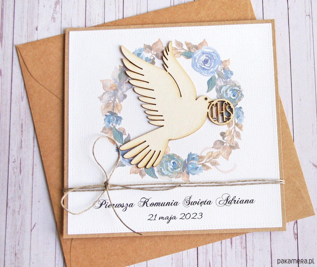 Kartka, PERSONALIZACJA :: I Komunia Święta : gołąb IHS niebieska.