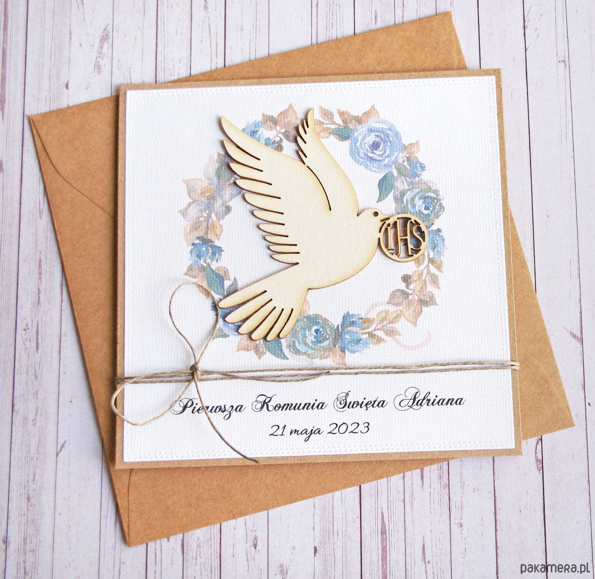 Kartka, PERSONALIZACJA : I Komunia Święta : gołąb IHS niebieska