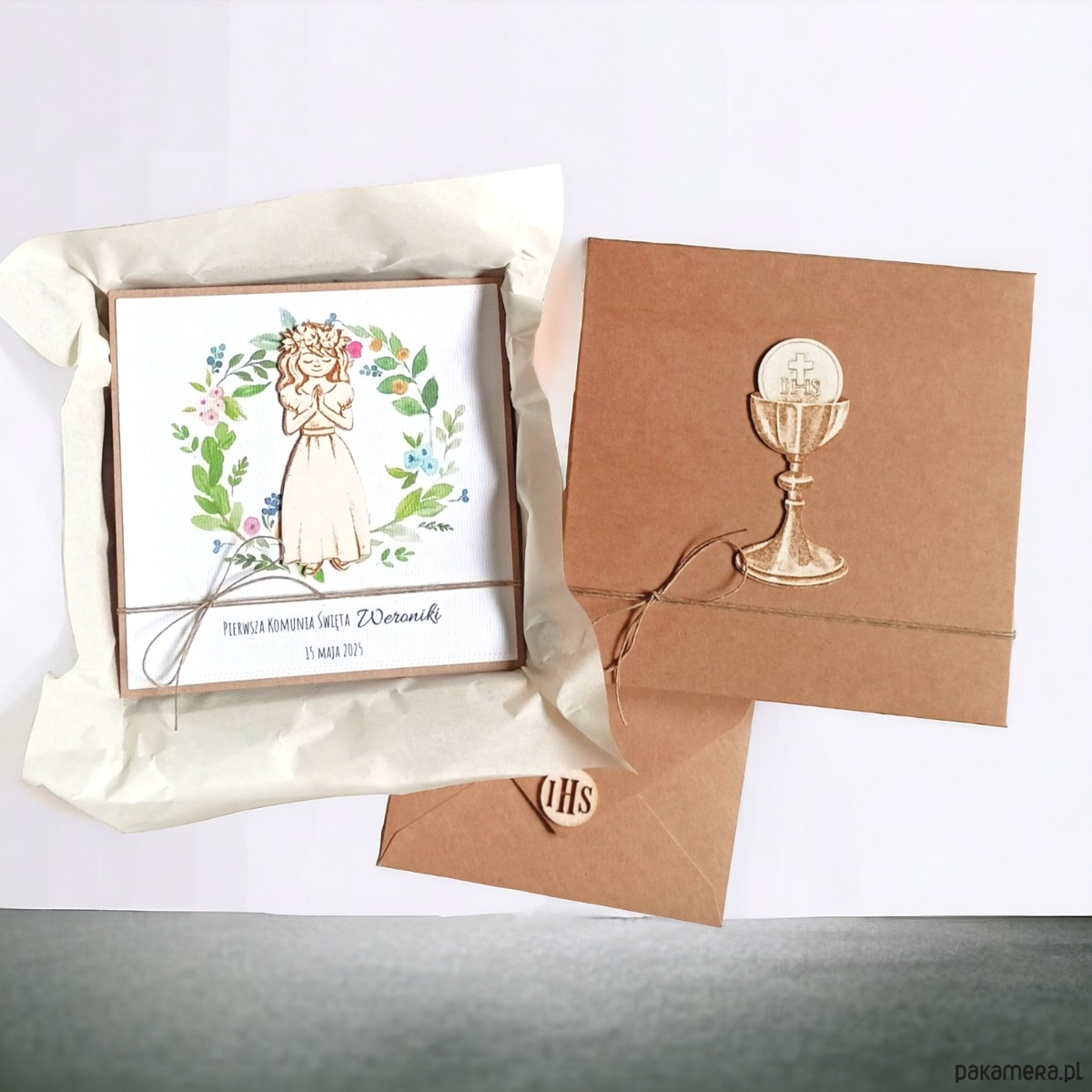 kartka wykonana na bazie grubego kartonu eko-kraft (100% makulatury),ozdobiona papierem wizytówkowym o fakturze płótna (z personalizacją) z drukowaną grafiką (wianuszek) oraz elementem premium z grawerowanej beermaty,; przewiązana jutowym sznurkiem.