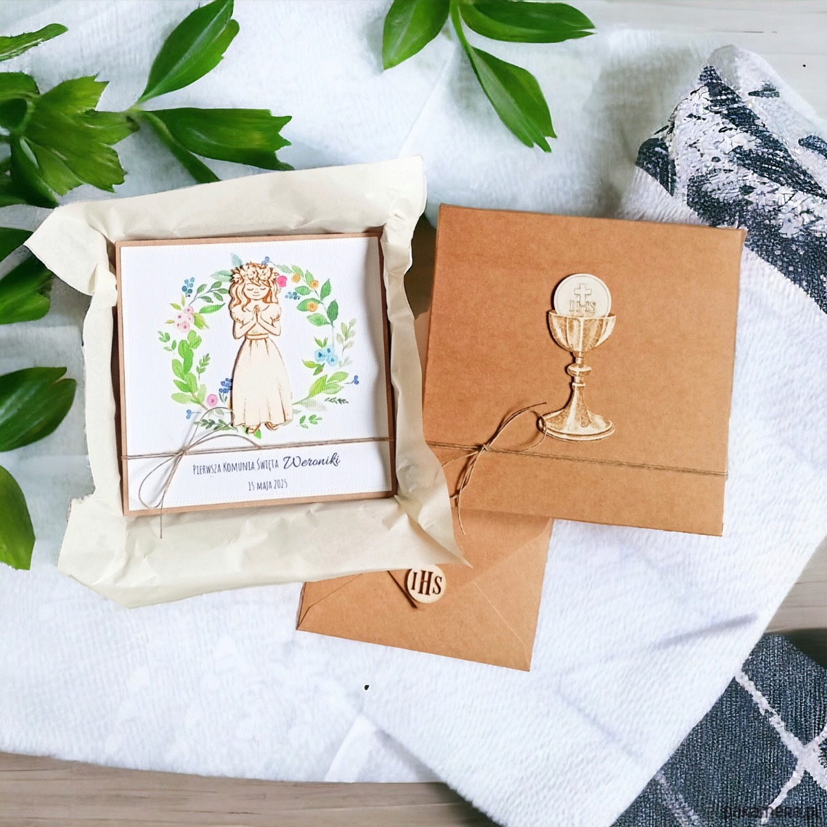 kartka wykonana na bazie grubego kartonu eko-kraft (100% makulatury),ozdobiona papierem wizytówkowym o fakturze płótna (z personalizacją) z drukowaną grafiką (wianuszek) oraz elementem premium z grawerowanej beermaty,; przewiązana jutowym sznurkiem.