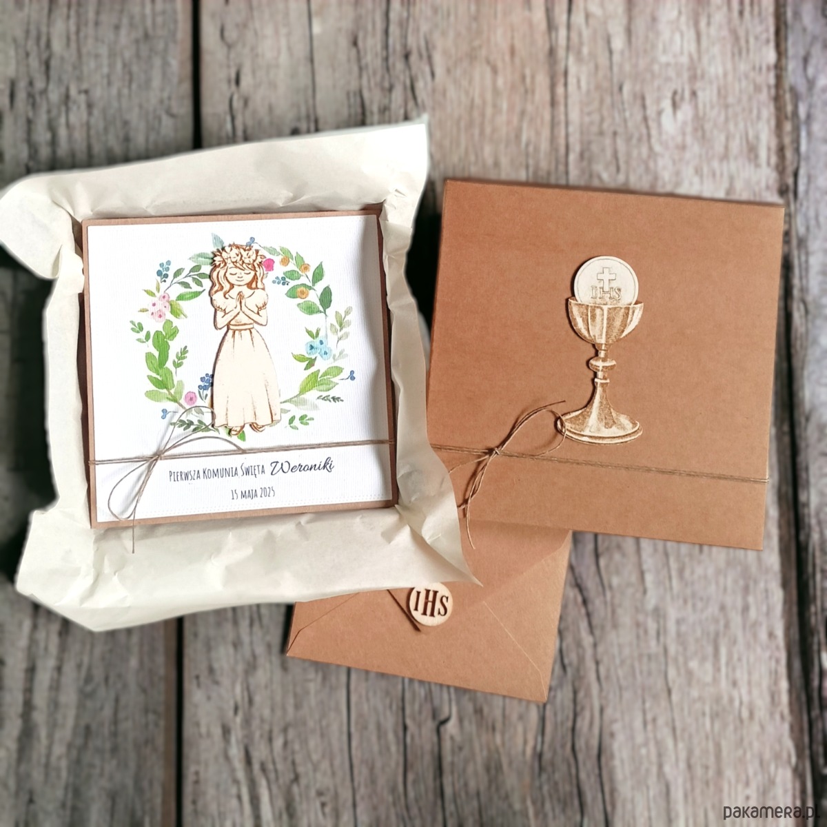 kartka wykonana na bazie grubego kartonu eko-kraft (100% makulatury),ozdobiona papierem wizytówkowym o fakturze płótna (z personalizacją) z drukowaną grafiką (wianuszek) oraz elementem premium z grawerowanej beermaty,; przewiązana jutowym sznurkiem.