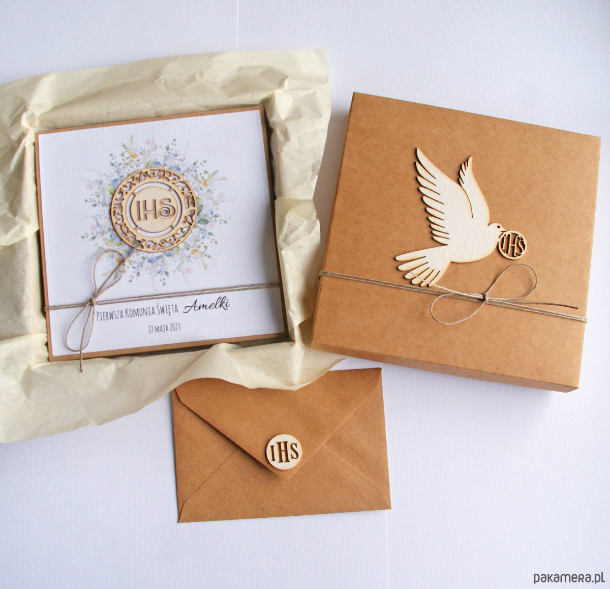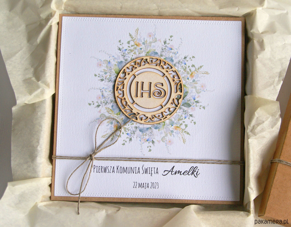 kartka wykonana na bazie grubego kartonu eko-kraft (100% makulatury),ozdobiona papierem wizytówkowym o fakturze płótna (z personalizacją) z drukowaną grafiką (wianuszek) oraz elementem z beermaty,; przewiązana jutowym sznurkiem.