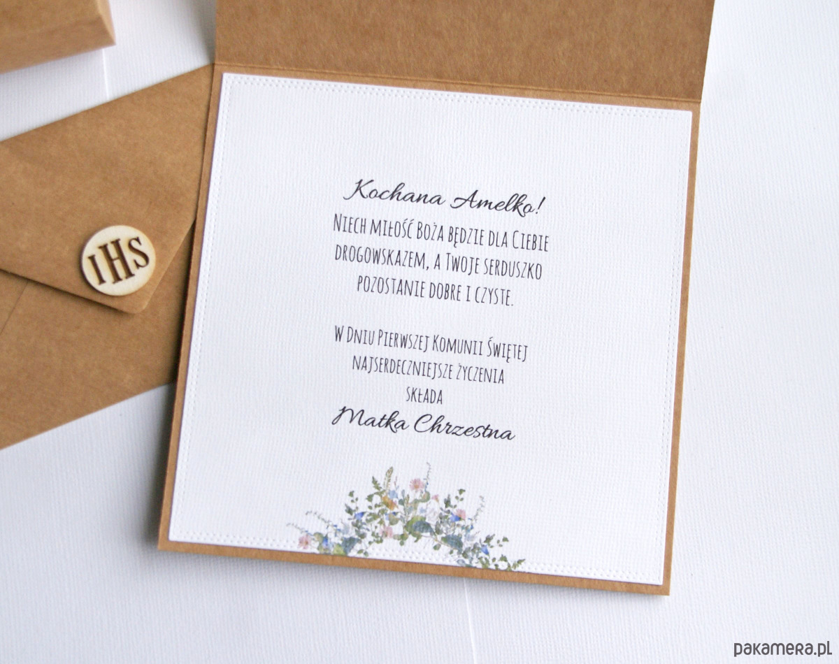 kartka wykonana na bazie grubego kartonu eko-kraft (100% makulatury),ozdobiona papierem wizytówkowym o fakturze płótna (z personalizacją) z drukowaną grafiką (wianuszek) oraz elementem z beermaty,; przewiązana jutowym sznurkiem.