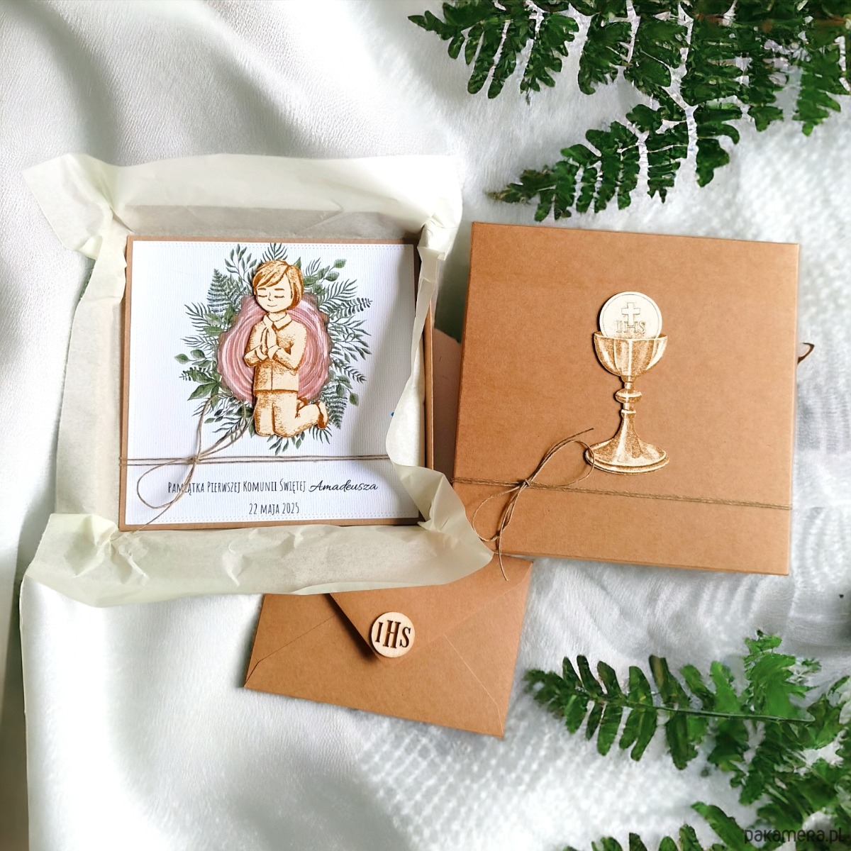 Kartka, personalizacja, pudełko, koperta : drewno: chłopiec