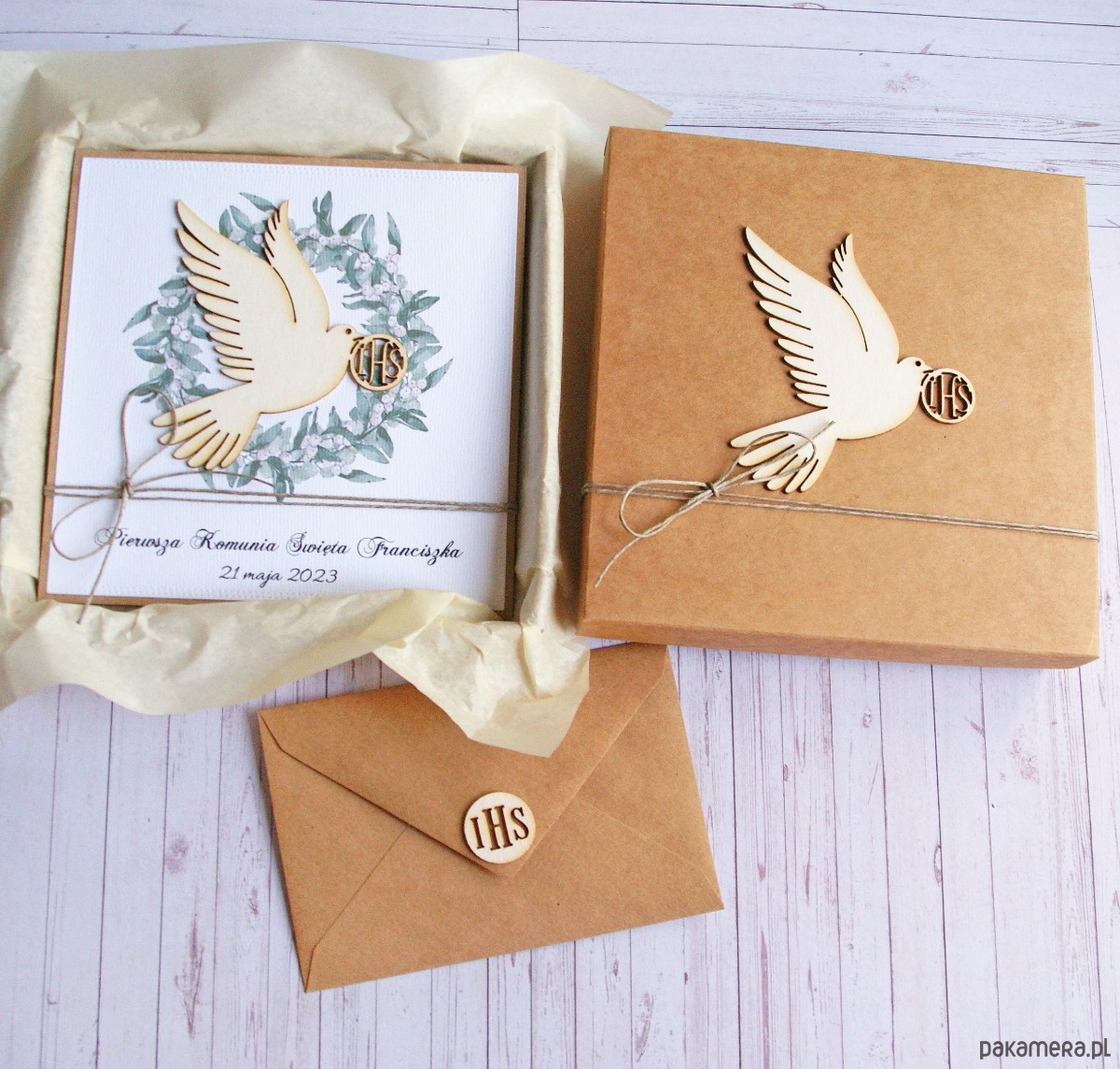 Kartka, personalizacja, pudełko, koperta : gołąb IHS