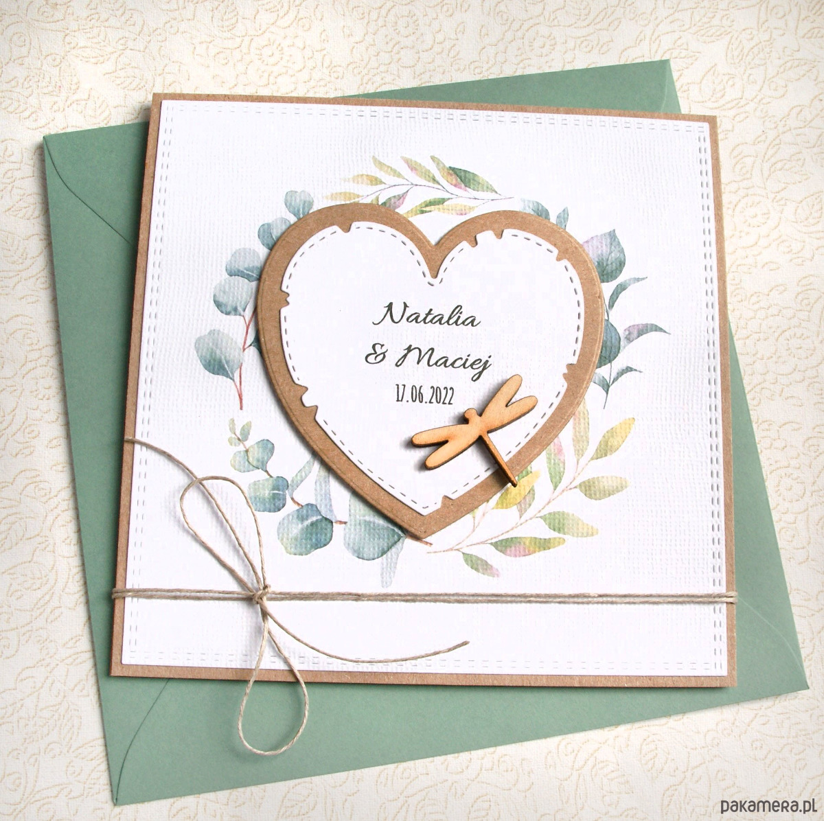 kartka wykonana na bazie grubego kartonu kraft (100% makulatury), ozdobiona białym papierem wizytówkowym z fakturą płótna (z nadrukiem), przestrzennym sercem z personalizacją oraz drewnianą ważką. przewiązana jutowym sznurkiem.