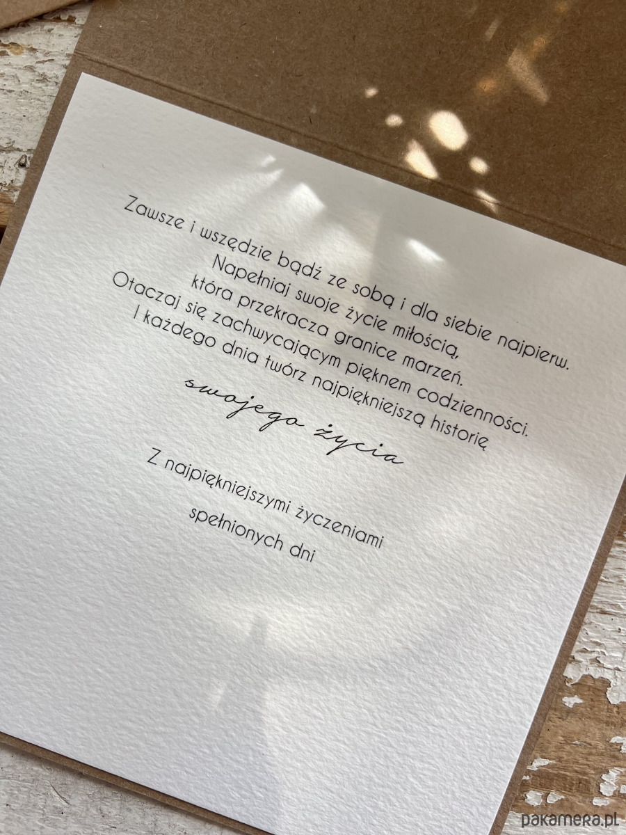 W środku wklejona jest jedna kartka z papieru bawełnianego z życzeniami widocznymi na zdjęciu. Zestaw zawiera kartkę oraz kopertę.