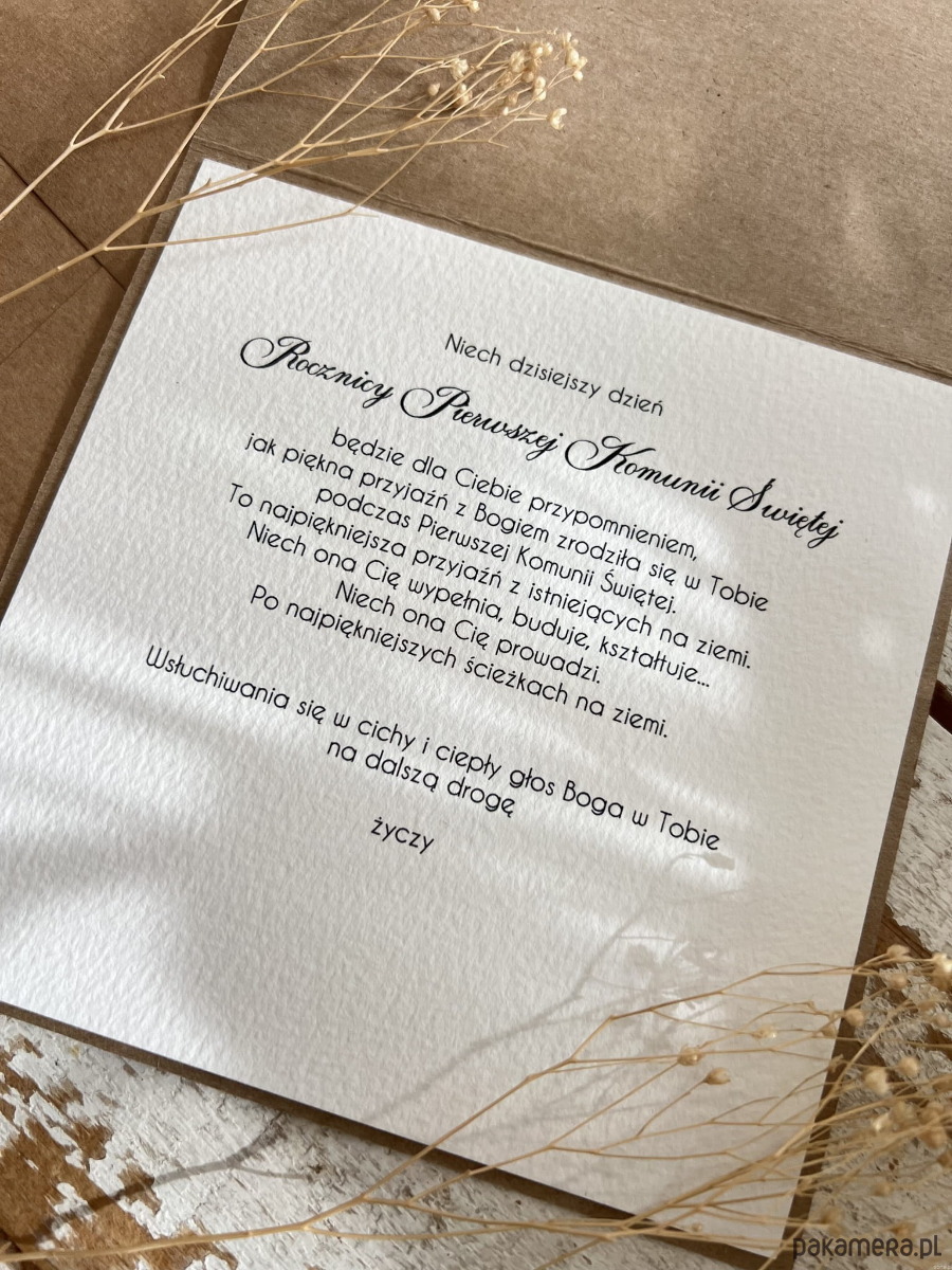 Kartka o wymiarach 14x14 cm wykonana jest z papieru kraftowego oraz papieru bawełnianego w odcieniu śmietanki z użyciem ozdoby tekturkowej. Kartka otwierana do góry. W zestawie z kopertą. W środku widoczne życzenia.